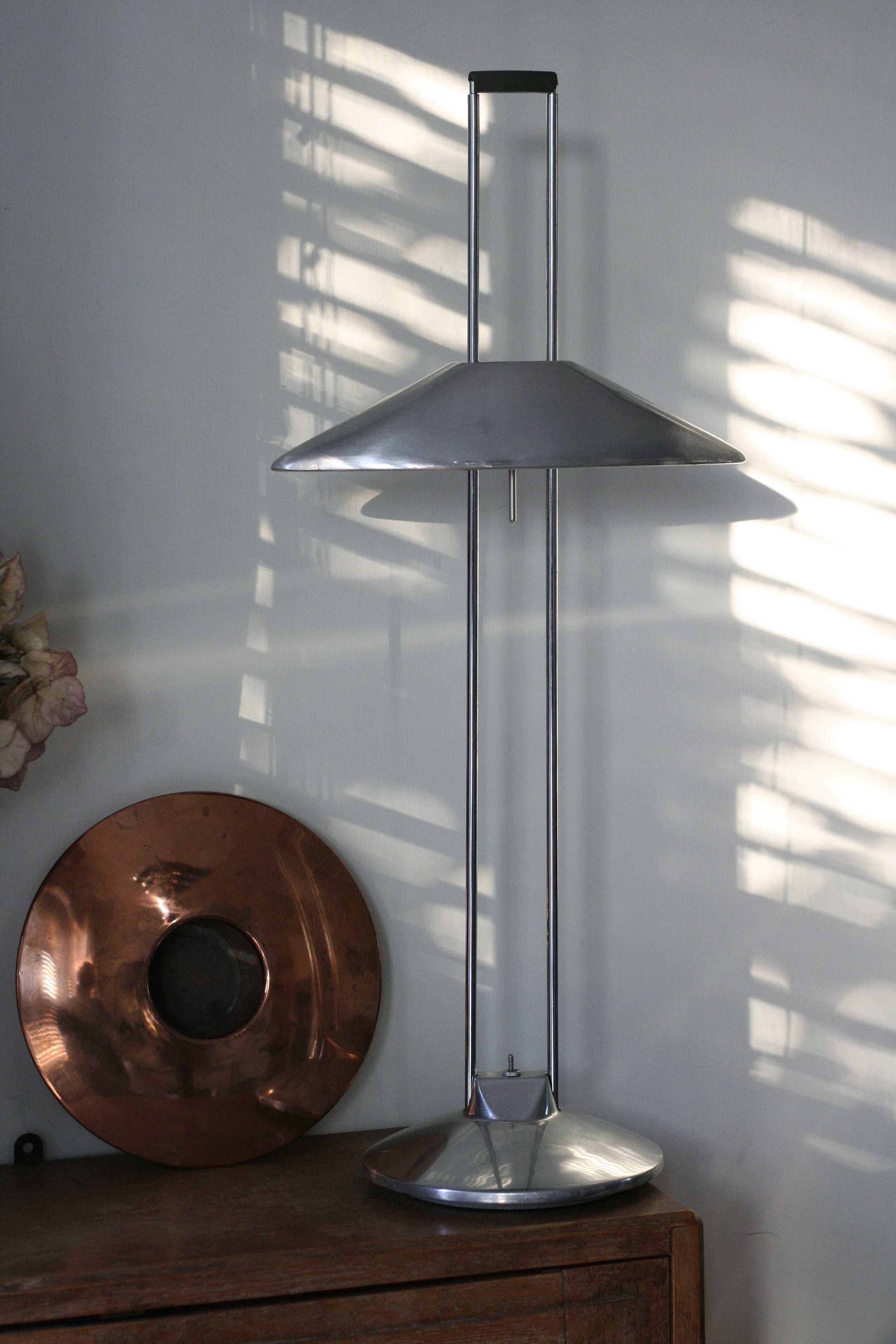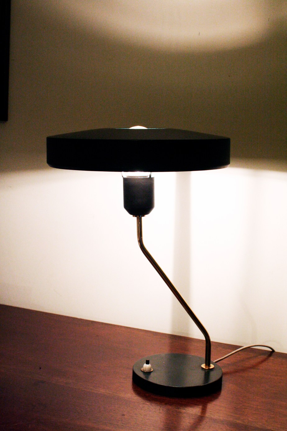 I was lucky enough to buy a pair of these lamps, a very dark green almost black painted metal shade and base, made by Phillips I think in the 70’s, rather nasty plastic switches which don’t always work, it would be good to replace those.