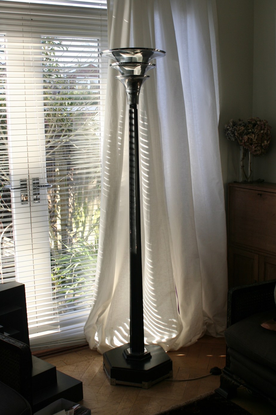The wooden post of this lamp was badly worm-eaten, now repaired, re-painted and the chromed steel shades polished, it is my favourite lamp. I assume it dates from the ArtDeco period but there are no clues in terms of maker’s labels or stamps.