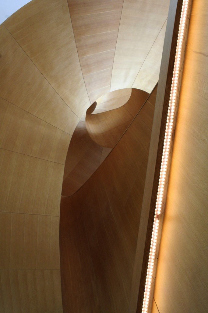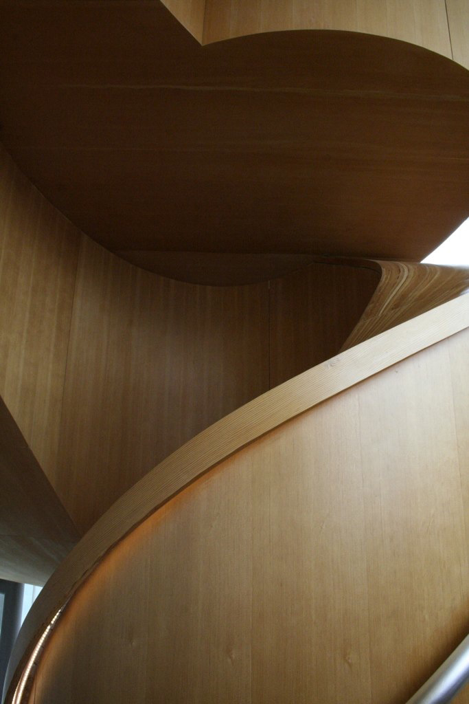 I spent quite a while taking of photos of this staircase. Walking down feels unusual as although the stair is open, the views outward are limited and you are enveloped in warm, subtly lit flowing forms.
