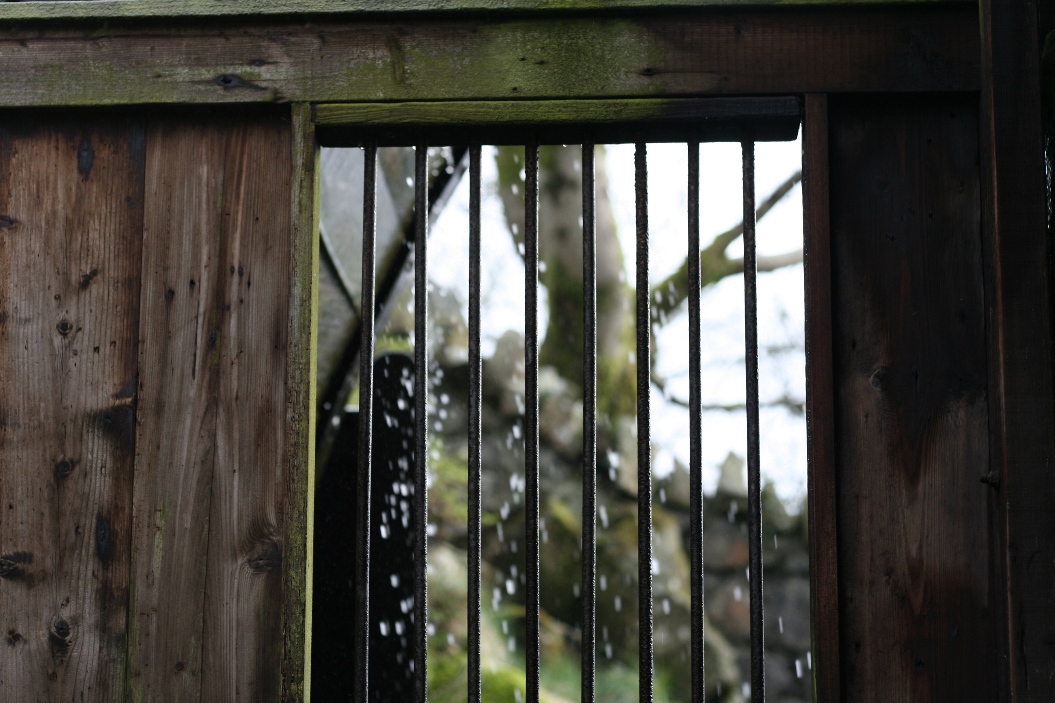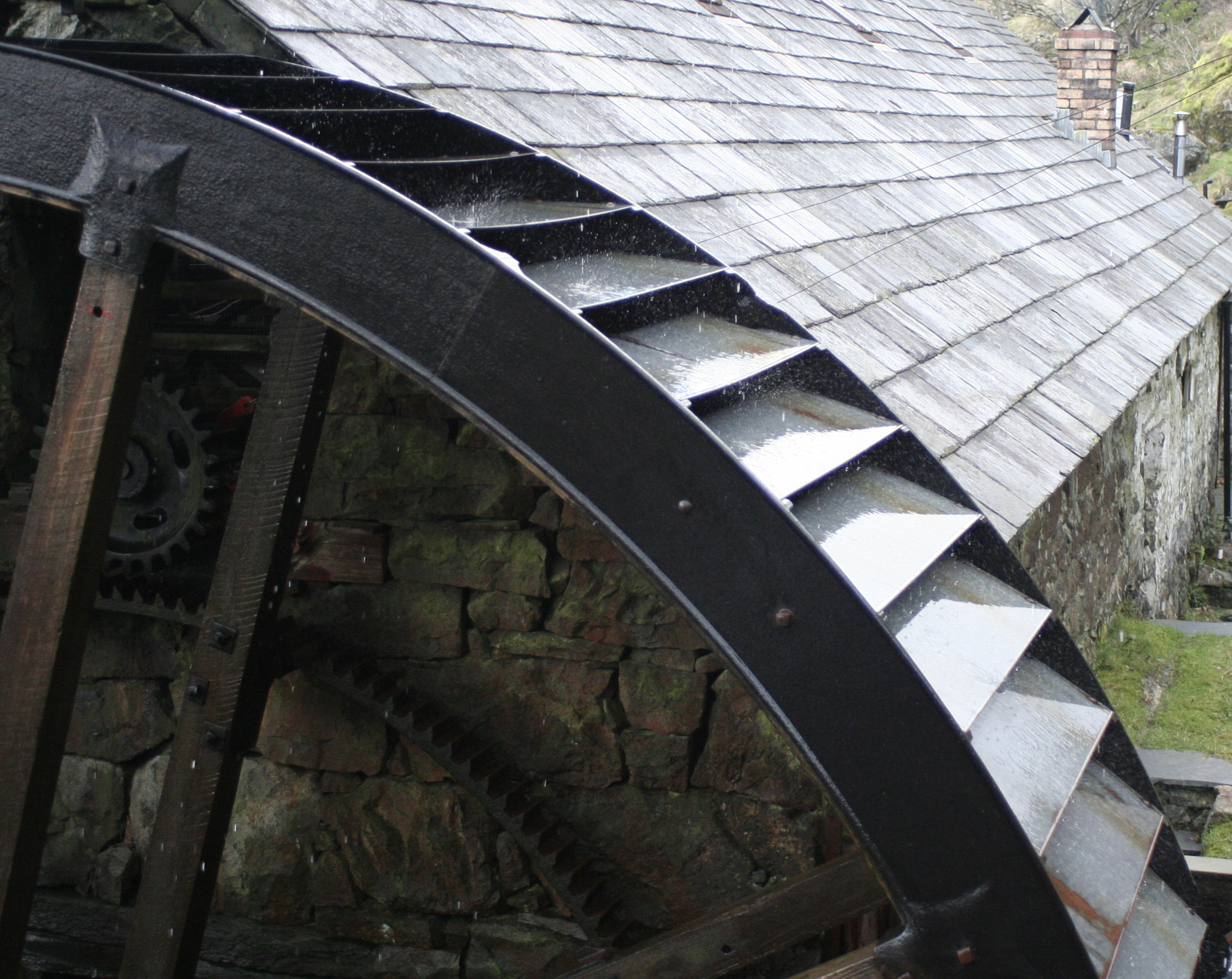 The watermill at Blaenau Ffestiniog, water drips running down in the gaps between the railings and below, the hods of thre wheel juxtaposed against the perspective lines of the slates on the roof beyond.