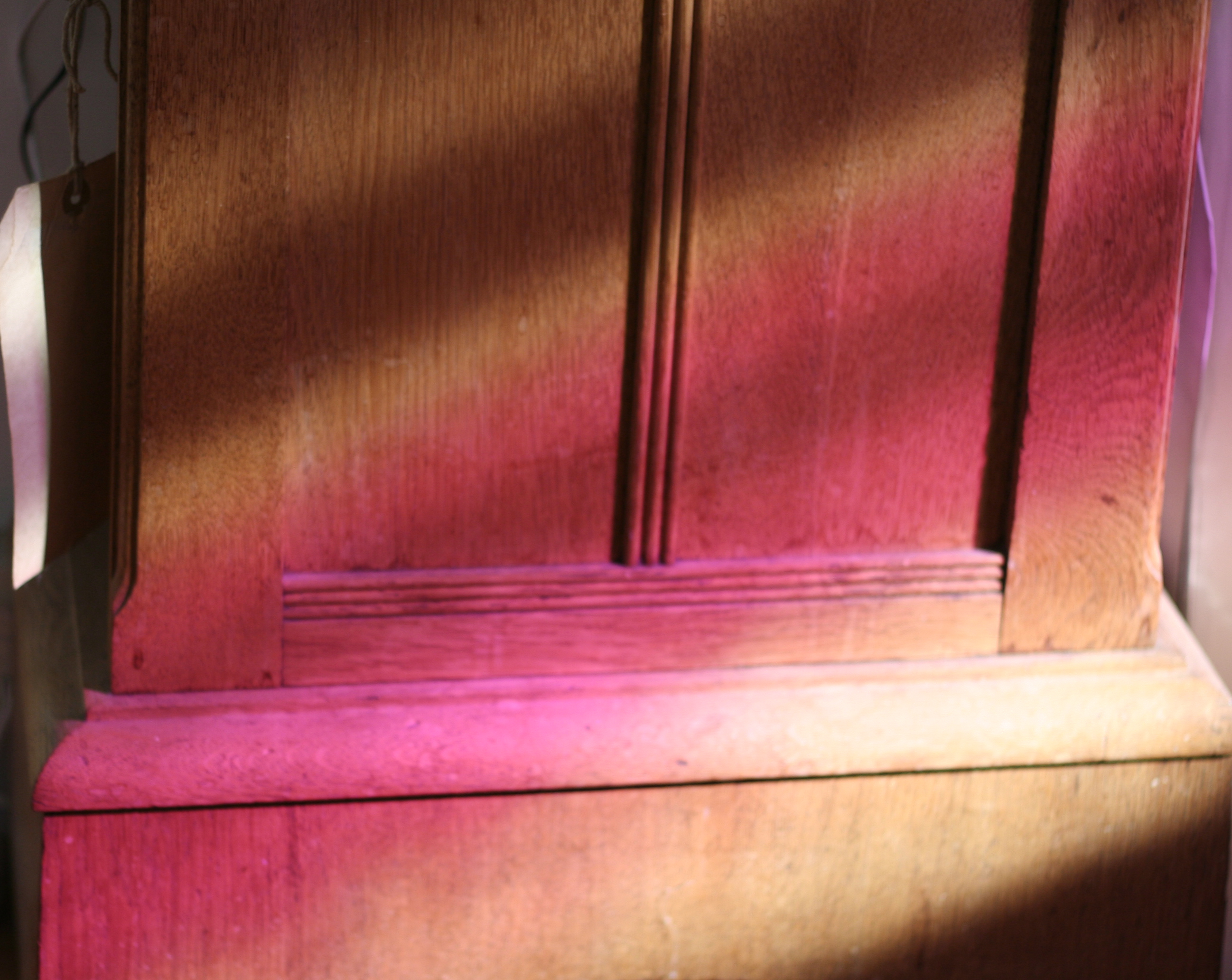 The morning sunlight was particularly vivid today just at the right time to fall through an early work by my mother Rosemary Wakelin casting a pink glow onto the wood floor and throwing a pink sash around the clock-case.