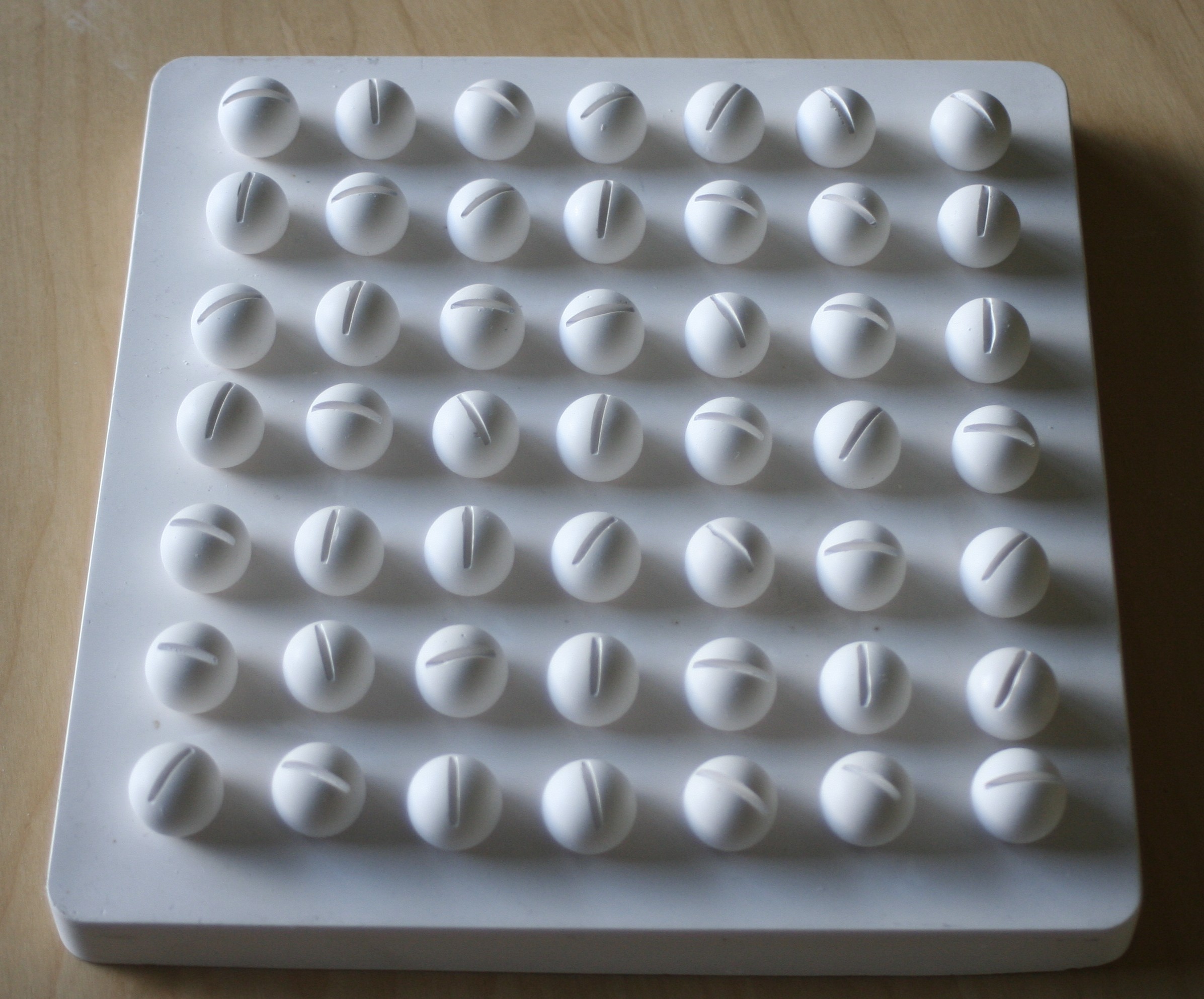 I am continuing to explore creating shadows with simple forms. These 3/4 plaster spheres have been filed to make a slot and then all 49 placed in a grid with the slots randomly positioned. Who knows why but looking at it makes me feel calm and peaceful, (although a little annoyed that not every sphere is in focus) must try harder. The spheres are about the size of a mint imperial, no-one has been fooled yet luckily, they could be nasty if swallowed!