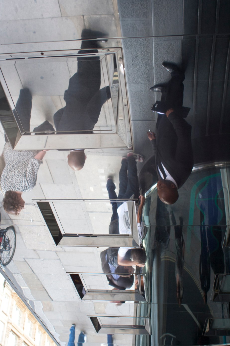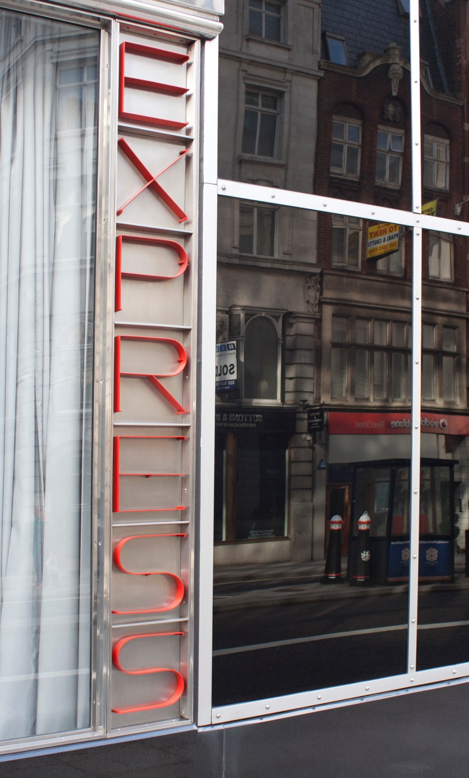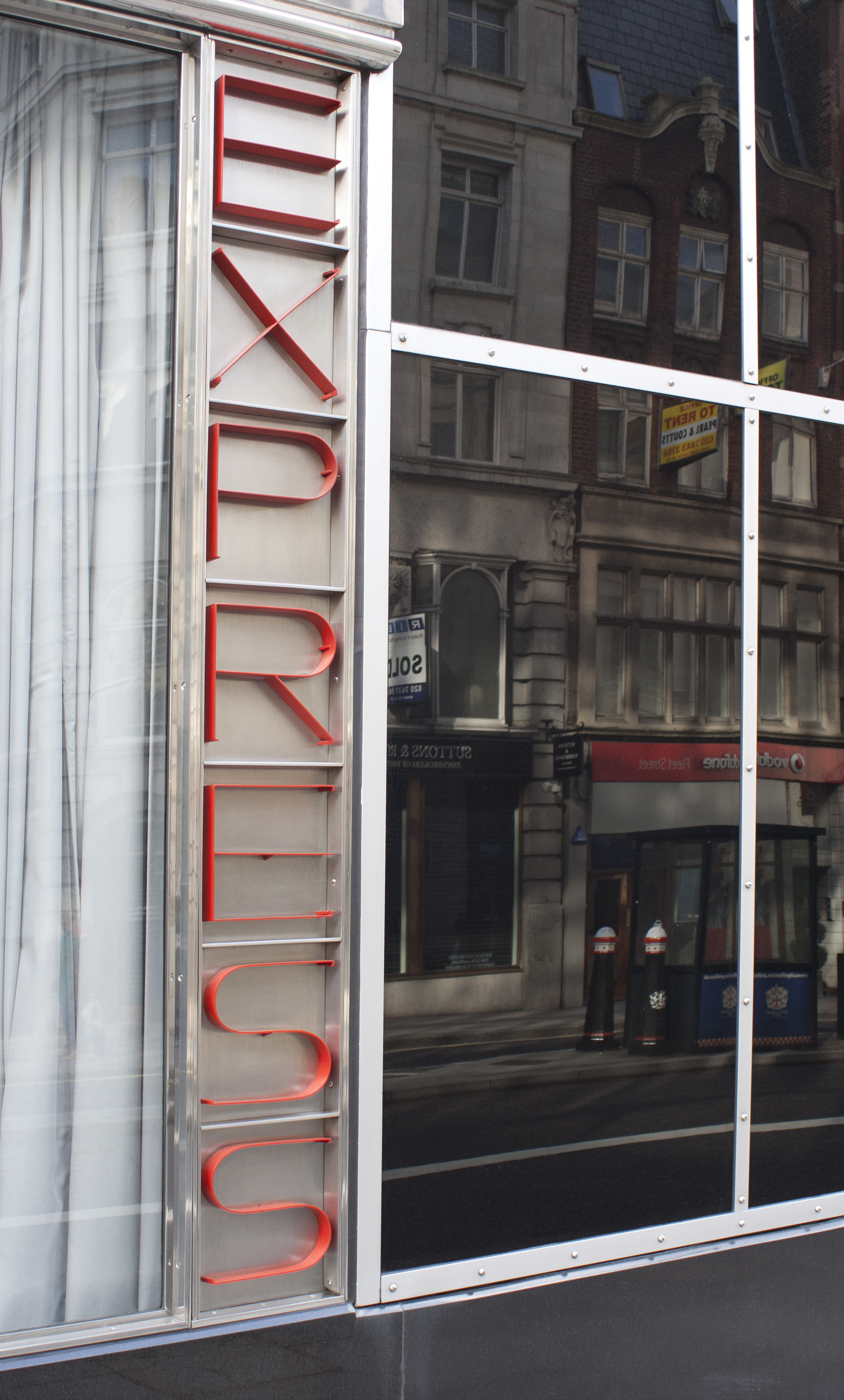 During the London Open House weekend, I visited the Daily Express building in Fleet Street, to see the extraordinary opulent Art Deco foyer. I took a lot of photos but the best ones were these two from outside, the reflection in the black glass portico ceiling and the red lettering with the reversed view of the opposite side of the street.