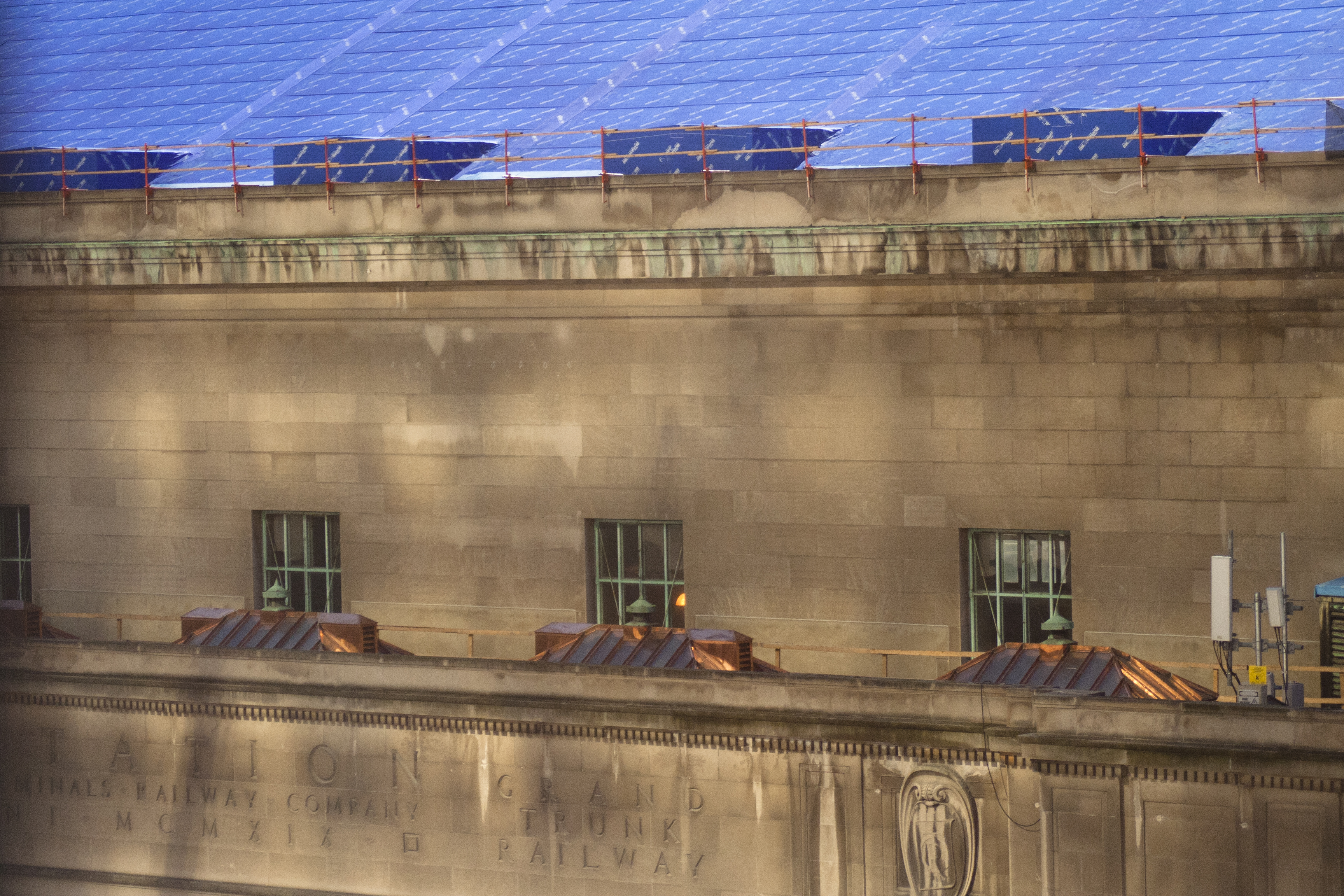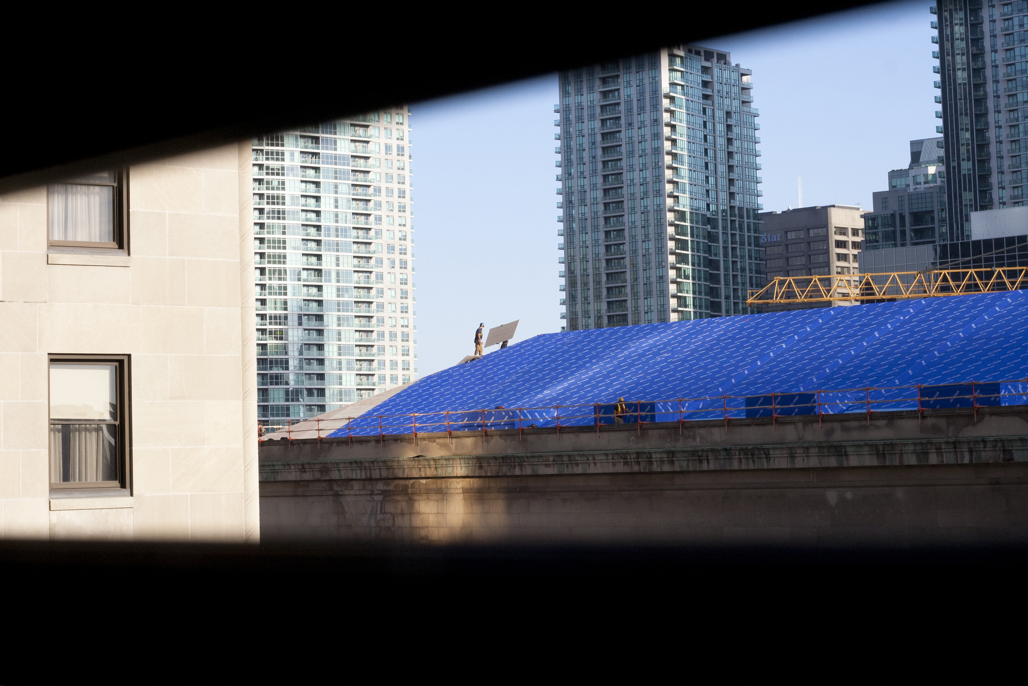 The Royal York Hotel in Toronto is a glorious remnant of grander times. The lobby is decked with fabulous chandeliers, the Library Bar provides that old world, dark-shadowed leather-padded comfort perfect for sipping cocktails all named after writers. There was a Mojito for Hemingway, a gin, lime and cucumber for Scott-Fitzgerald and a concoction with strawberry jelly spheres, orange juice and Grand Marnier called “Breakfast of Champions” for Kurt Vonnegut. My room was on the third floor facing onto Front Street with expansive views over Union Station and the high rise blocks down toward the lake. After numerous “jumpers” the hotel has decided to restrict the opening of all windows to 4 inches, making photographing somewhat challenging. I managed to push my telephoto lens through the gap to capture these views of the re-development of Union Station in the evening light, the newly-coppered roof-lights glowing softly against the honey coloured stone, set off by the garish blue of the blue lining of the new roof.