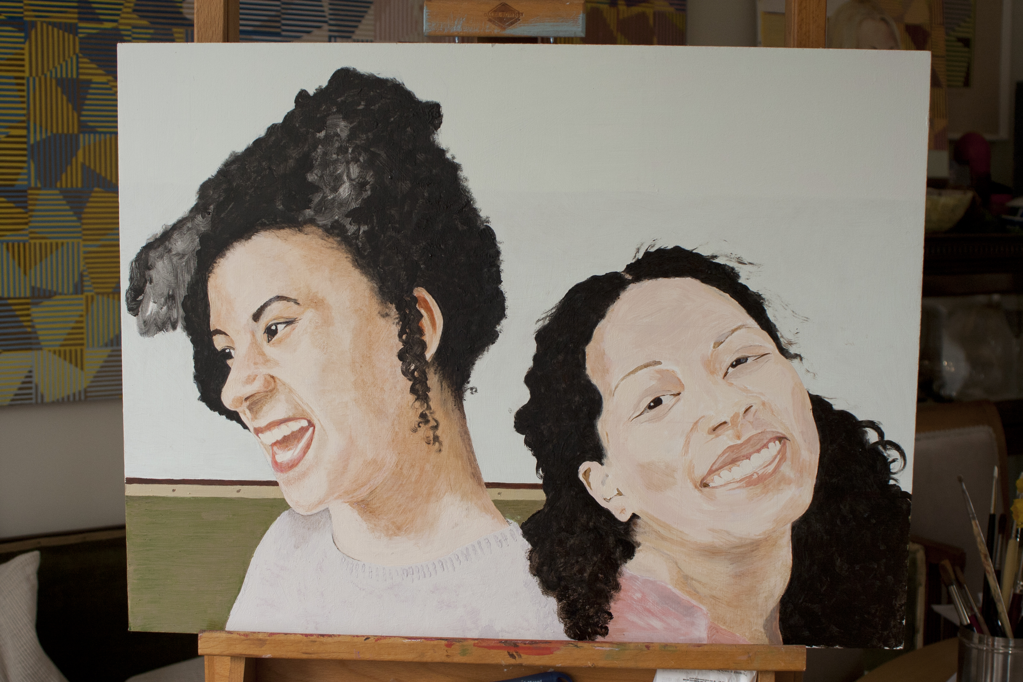 I am enjoying painting so much, I had forgotten how satisfying it is to capture an expression, a likeness. Two-thirds of the way through this painting, I have yet to complete the glazing and warming of the skins tones in the girl on the right and there are more tresses to add at the far left. I may also add detail to the background if I have time. (only 4 or 5 painting days left before the deadline) The sitters, I am glad to report, seem genuinely pleased. They are sisters and each of them has remarked on how good the likeness is of her sister!