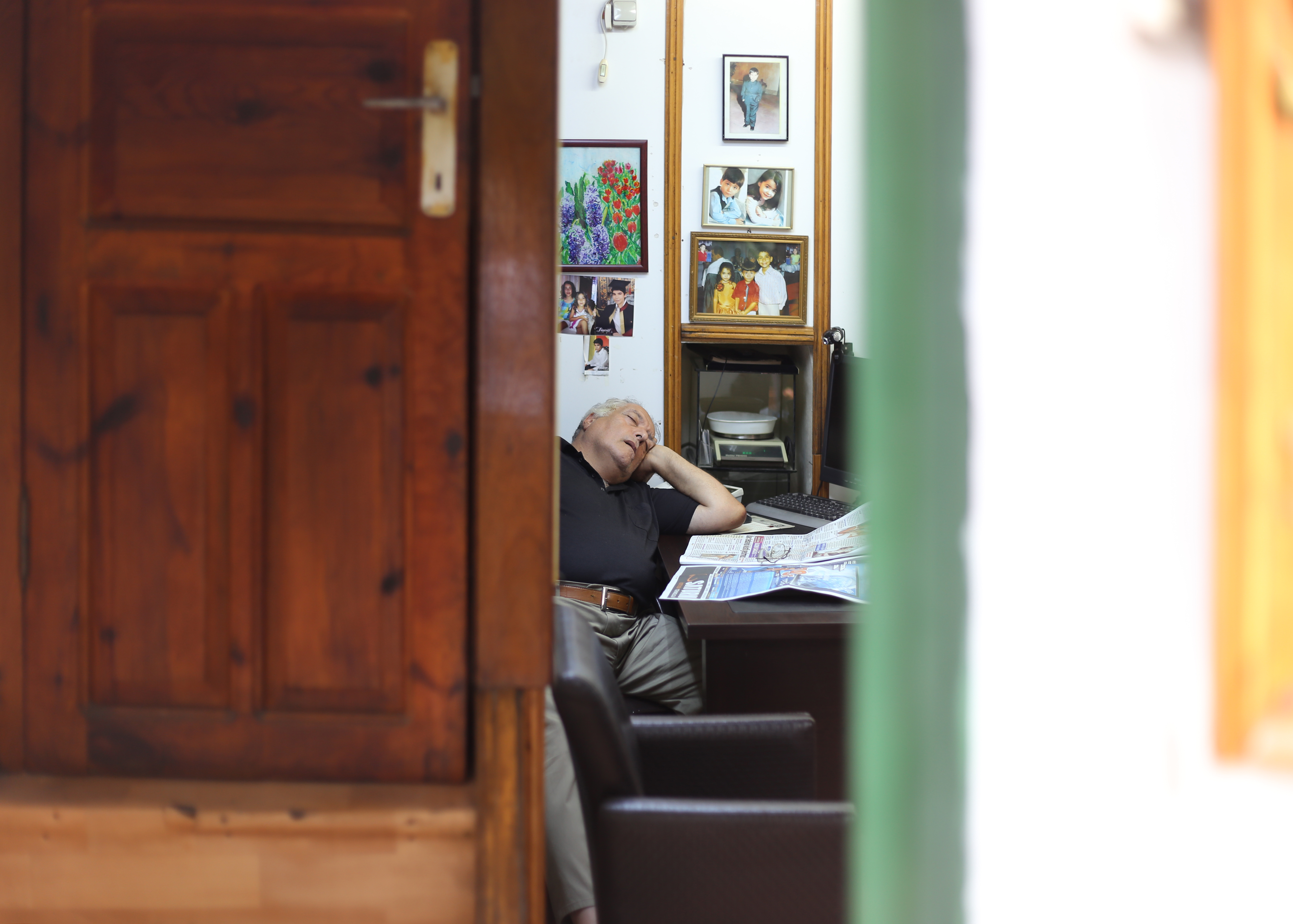 His father makes the tea and washes the glasses in their diminutive kitchen, his younger brother is the apprentice, fetching and carrying and getting under their feet. The equipment is ranged within easy arm’s reach, every single thing in its right place except for the electrical cables which swoop and swerve like a trails of birds.