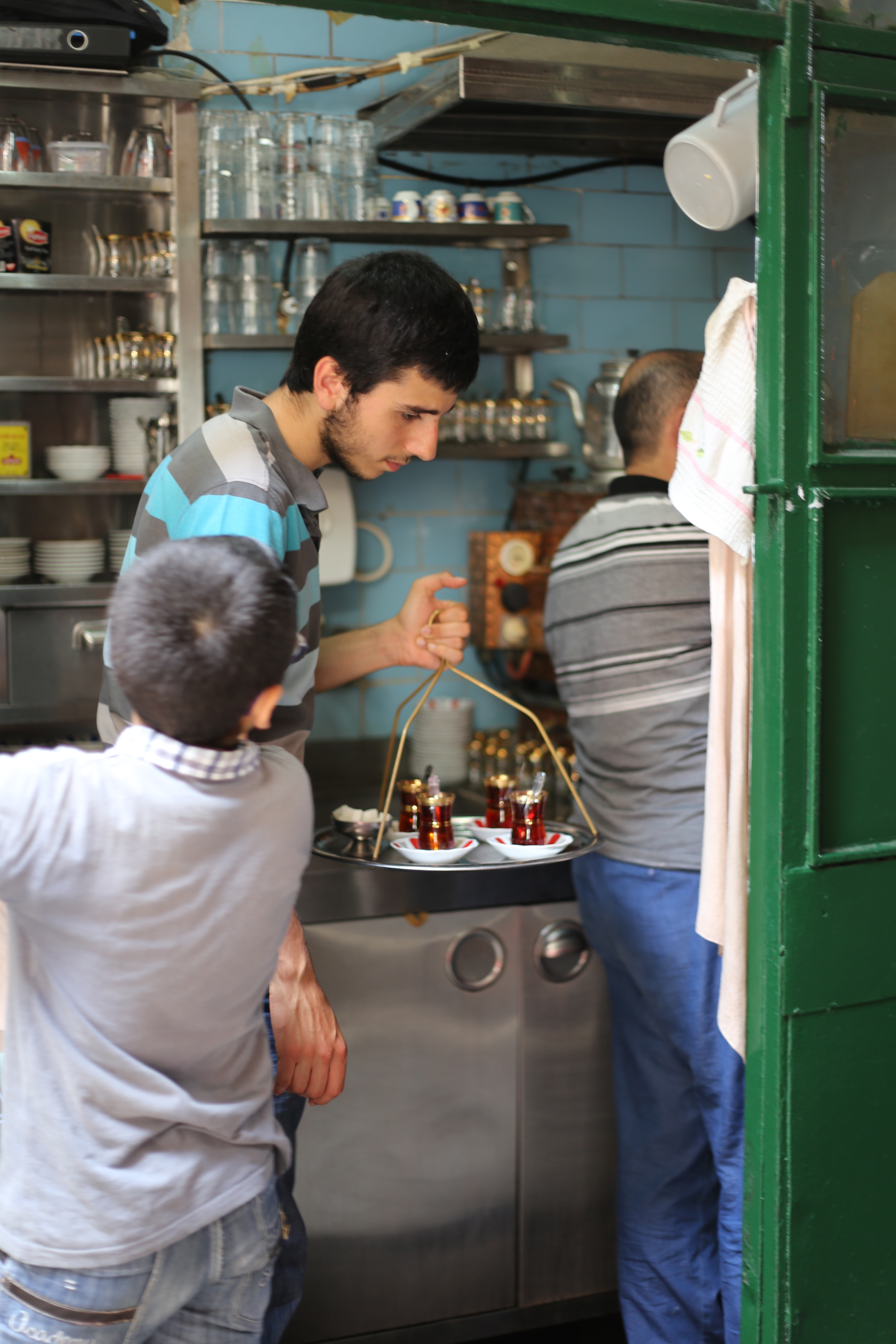 In another sector of the bazaar there is a narrow alleyway between the arcaded shops, which mostly goes unnoticed by the shoppers dazzled by the wares on offer all around. In this alley the walls have been polished by bodies that have bustled through the corridor going about their business, now they reflect all comings and goings of the traders and the changing light. A tea boy enters the alley and sees me lurking with my camera at the opposite end, he signals to me, at first I see it as a dance-like gesture, its only when I review the image later I realise he is saying “Yeah, take my photo!” He stops when he reaches me and I show him his photograph, “verry niiice” he says in a rich Turkish accent, smiles and nods and is gone before the tea gets cold.