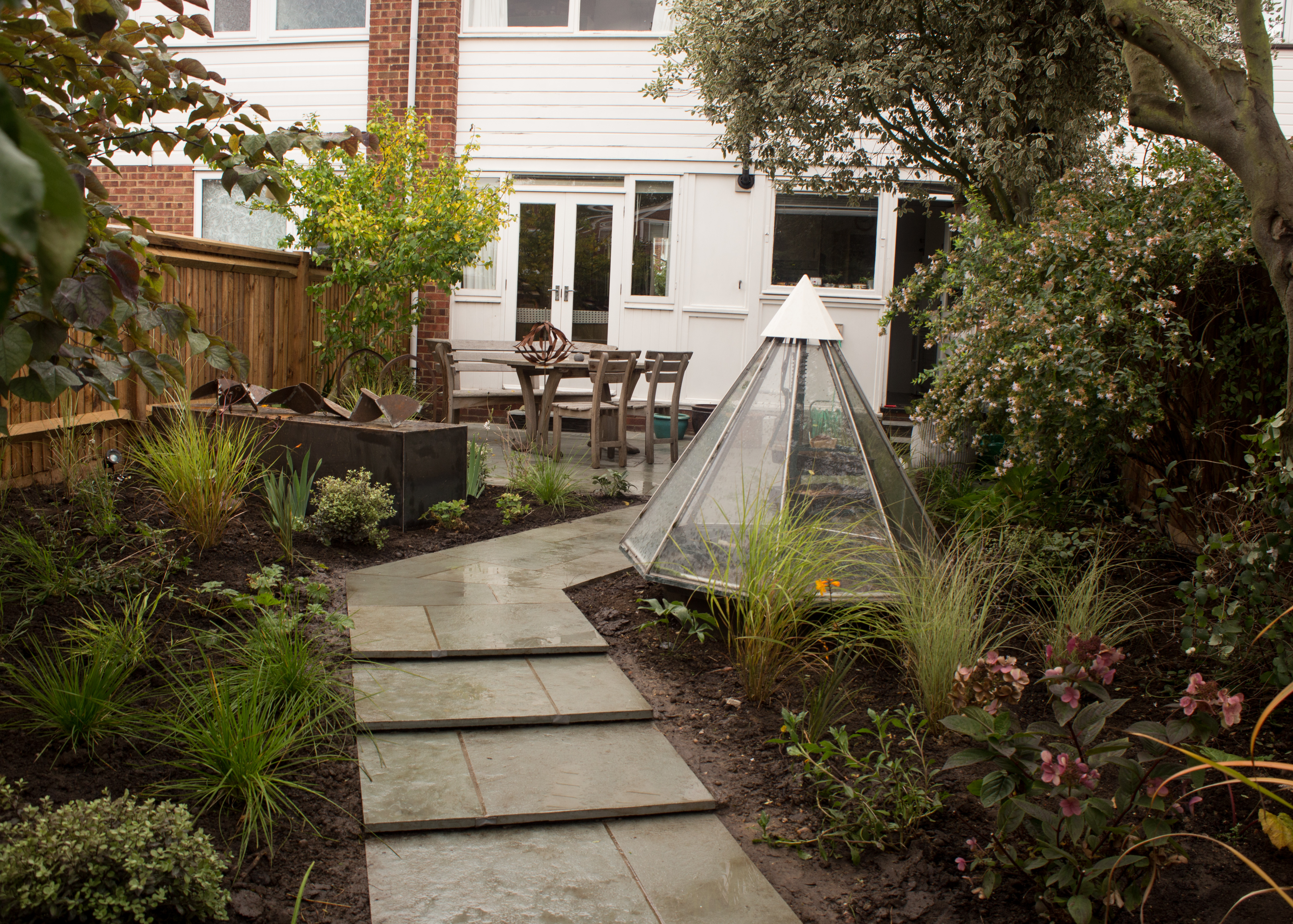The ugly cracked concrete crazy paving was dug up and replaced with a larger area paved with blue/green stone leaving plenty of space for the table and chairs, a wide path was laid with a 127º angle echoing the footprint of the greenhouse and with shallow steps leading down the slight incline to the garage.