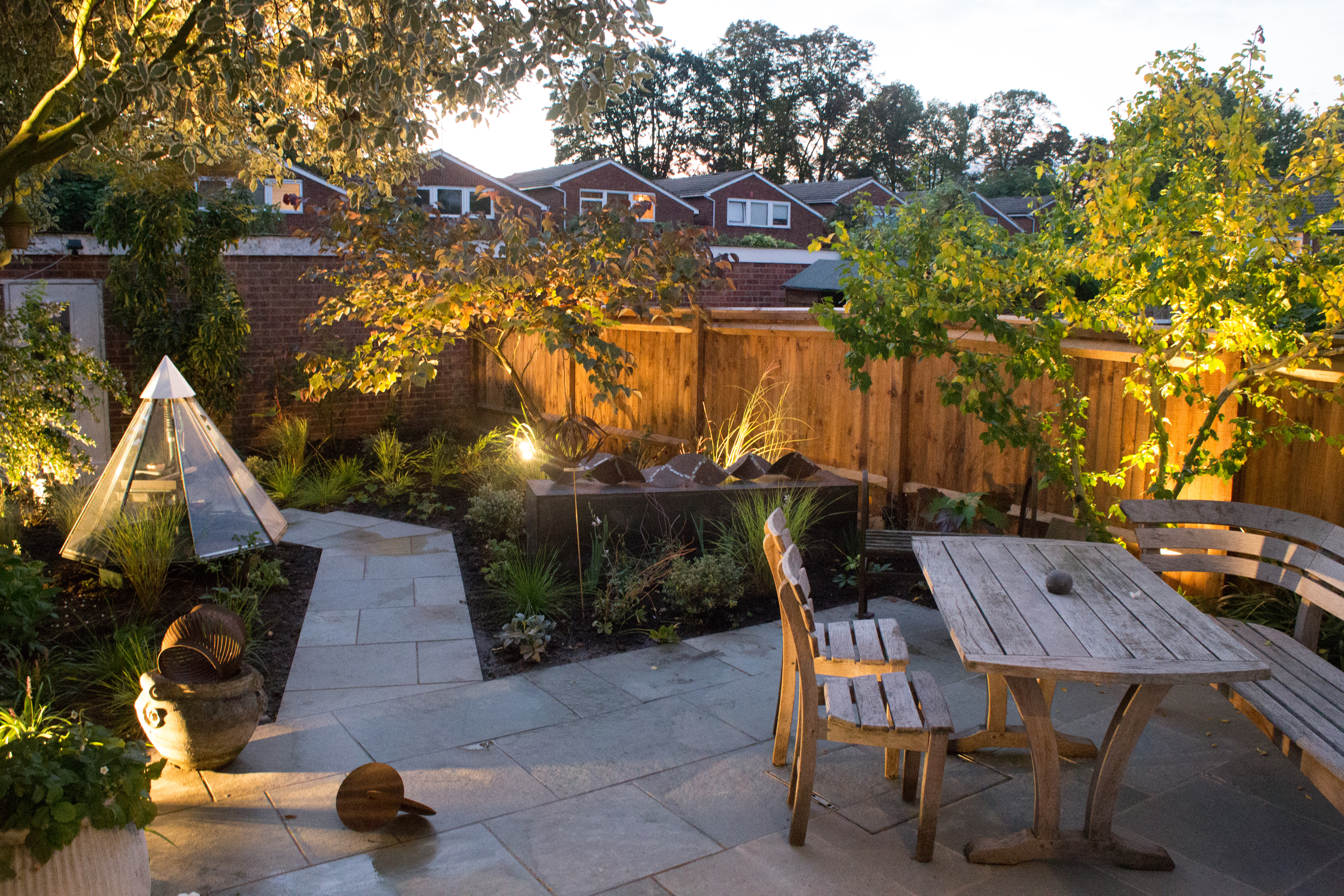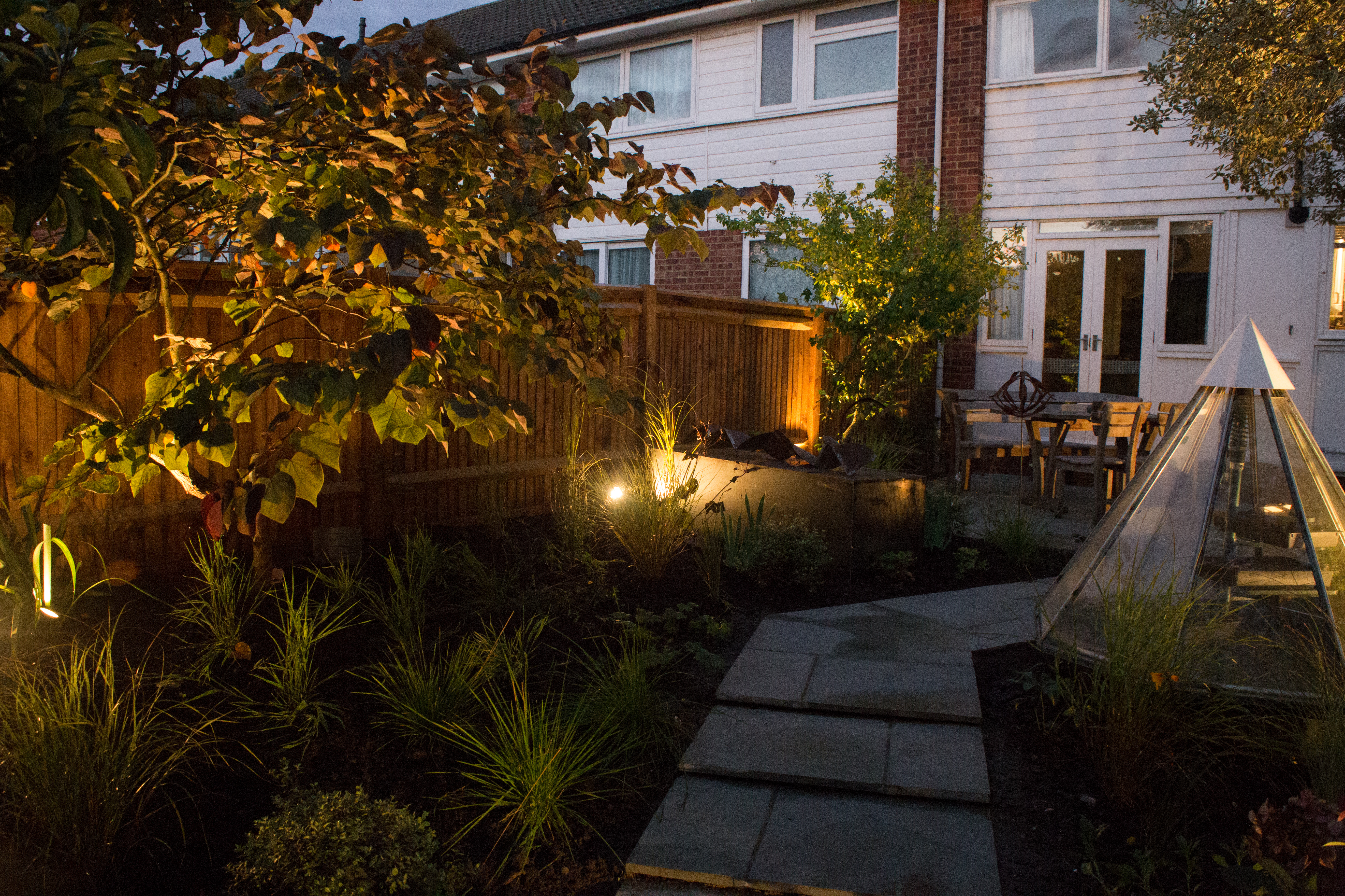 A place that for a long time has been forlorn is now a sunny spacious delightful garden to spend time in or to look upon at night when lit up by strategically placed lamps.