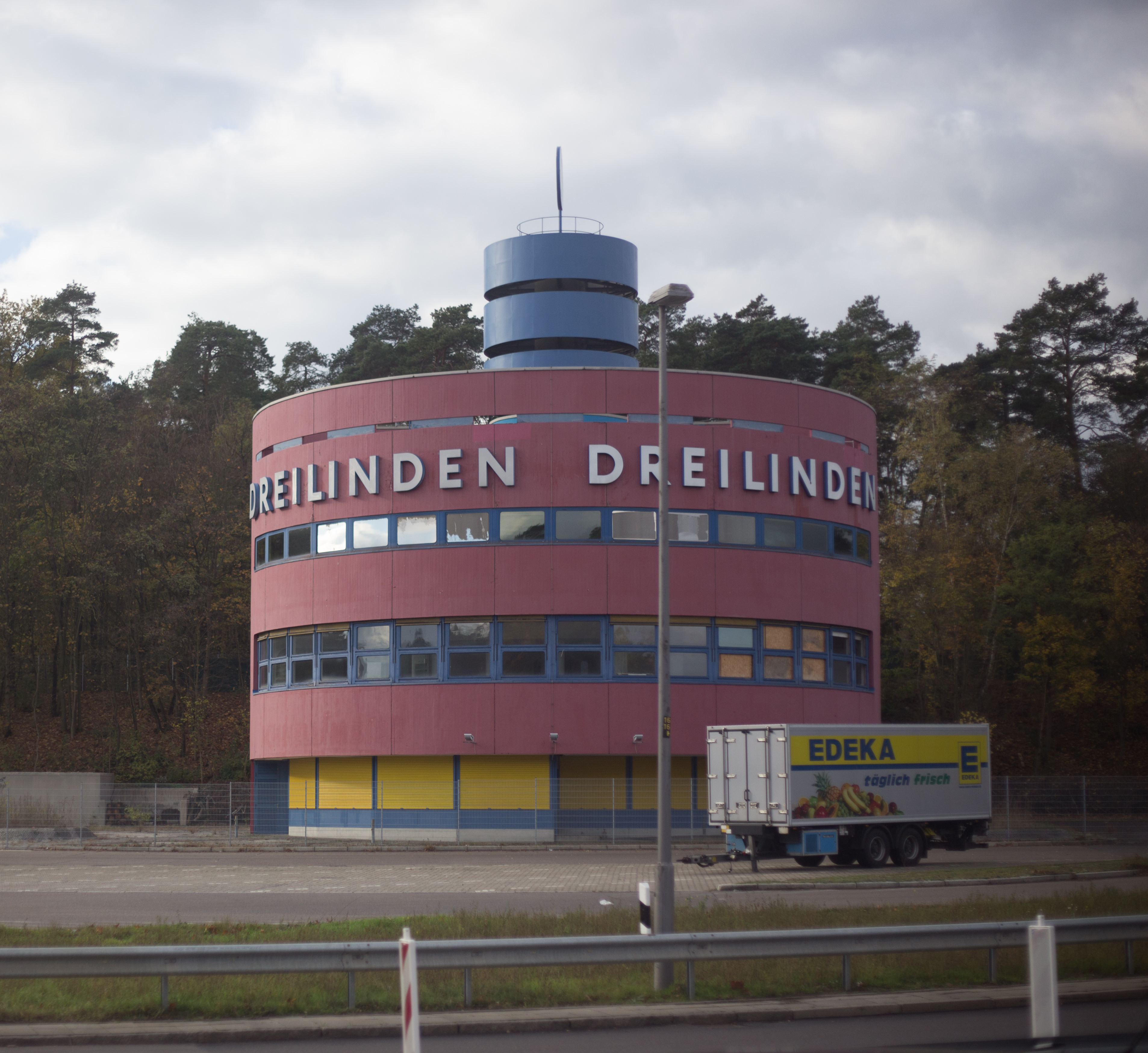 Drei Linden, or Checkpoint Bravo as it was also known, on the motorway between Berlin Tergel airport and the former East Germany. No doubt originally unpainted concrete, the current funfair colouring, red with blue windows belies its former grim purpose.