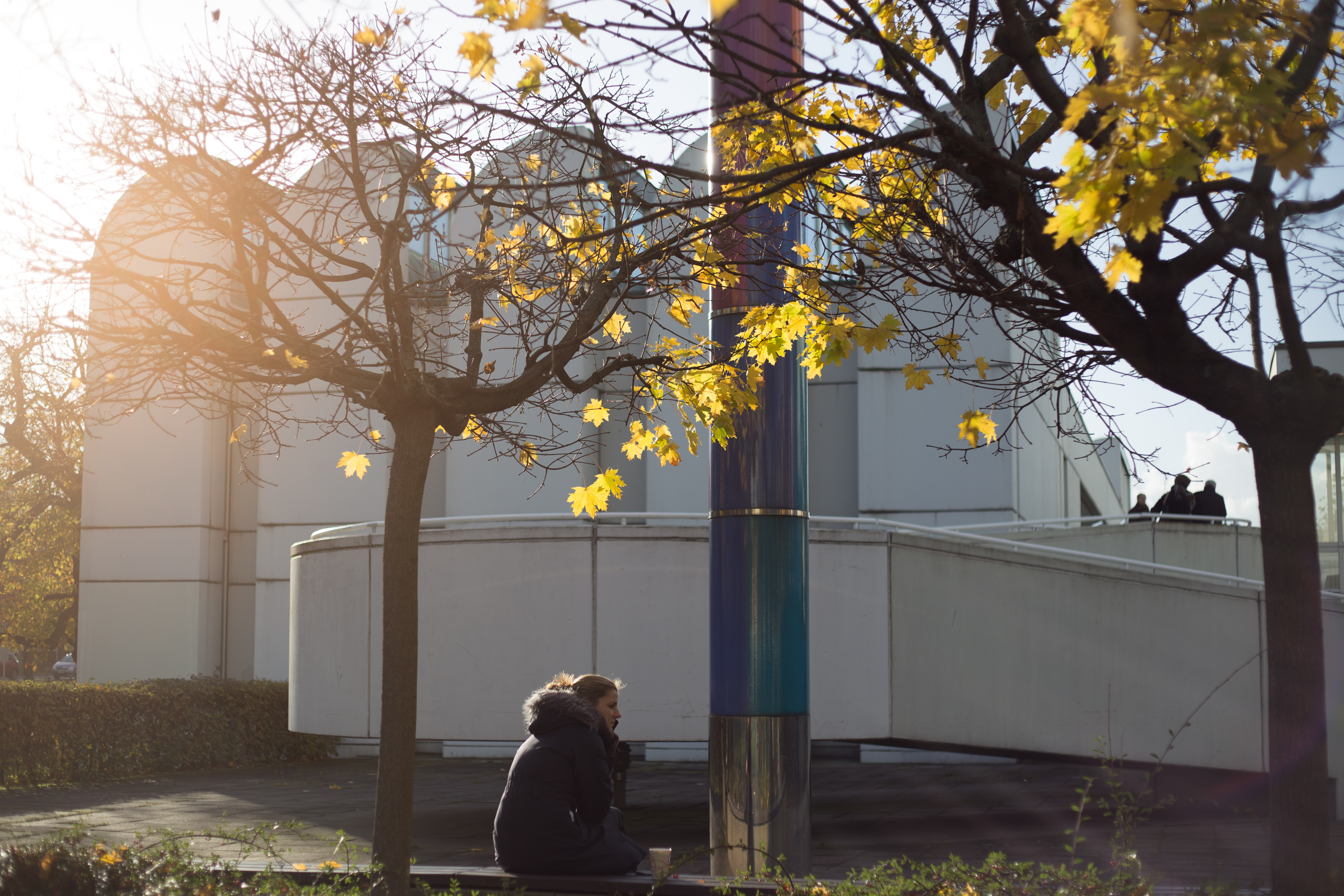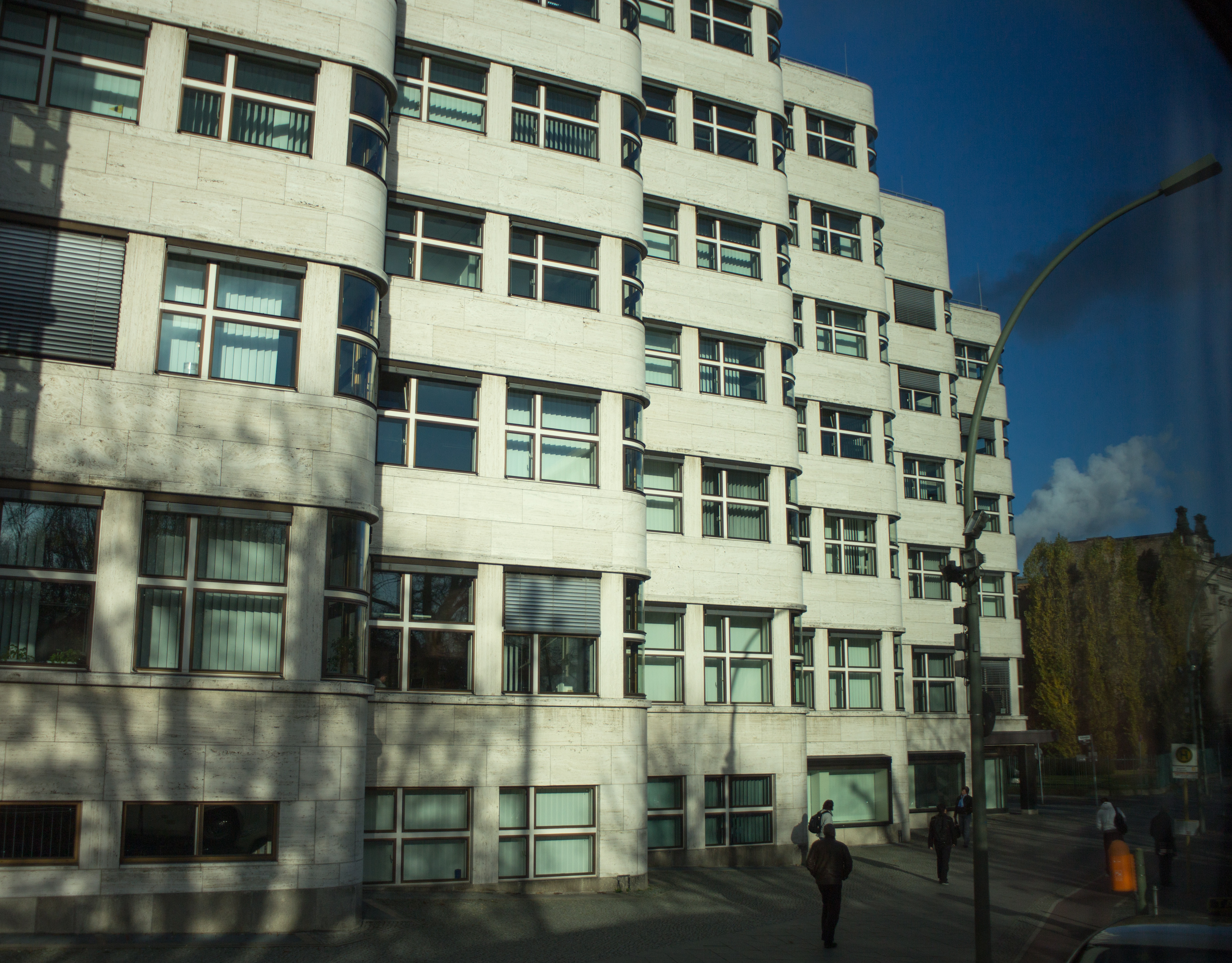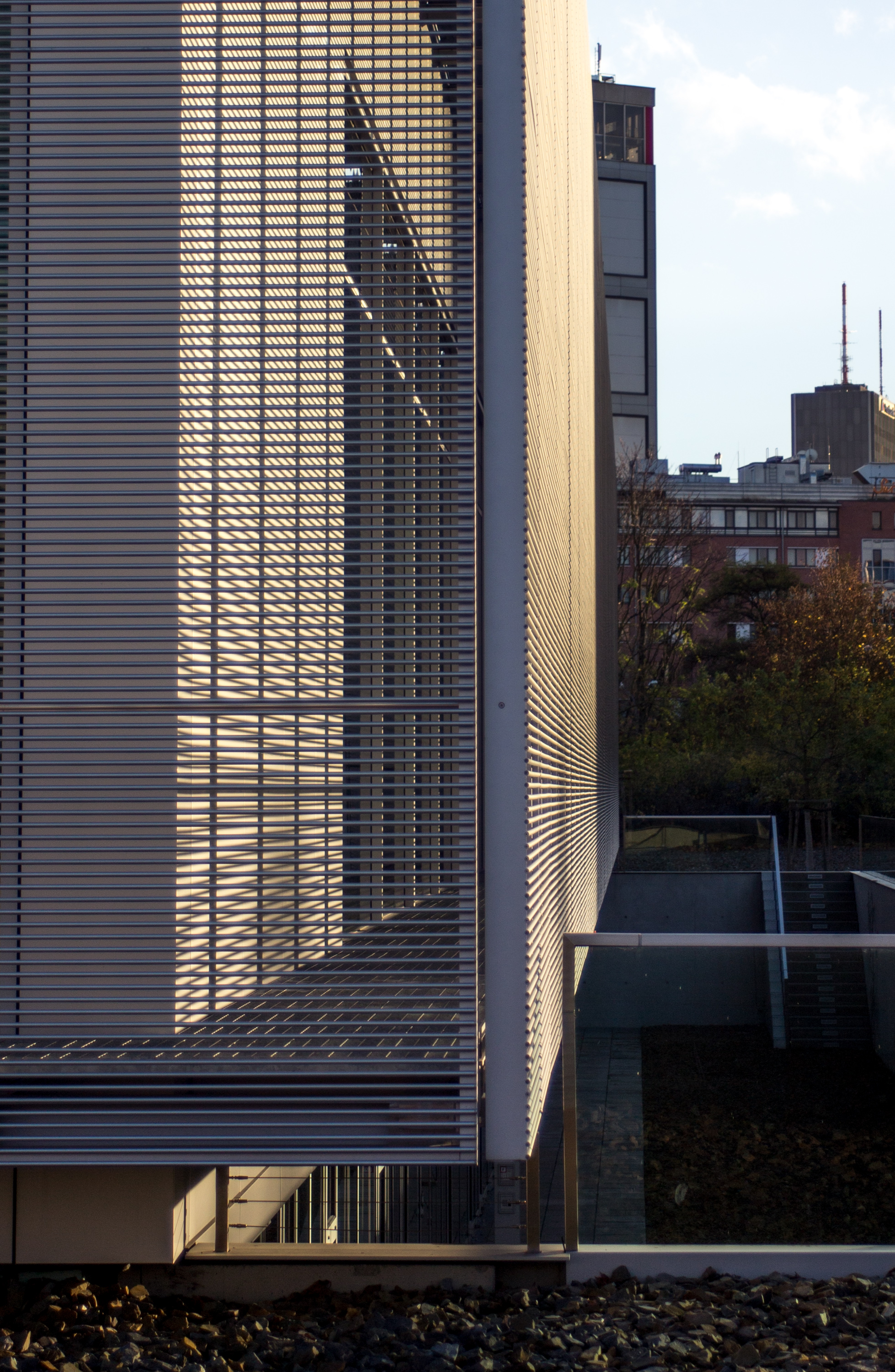 The external structure of steel rods or shafts catch the light and cast shadows giving the whole structure a nebulous appearance, quite the antithesis of the stern buildings that preceded it under the Third Reich. Ursula Wilm