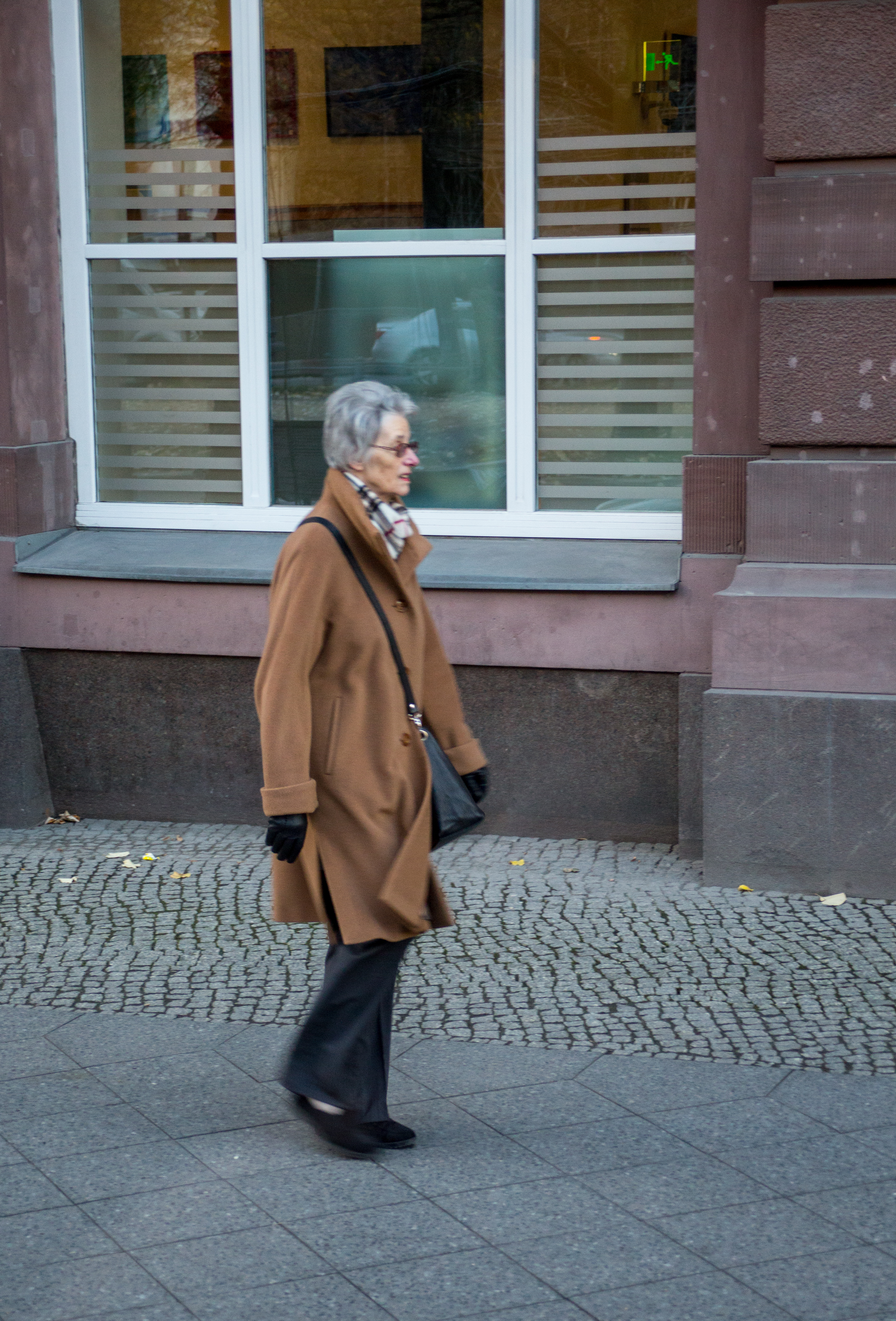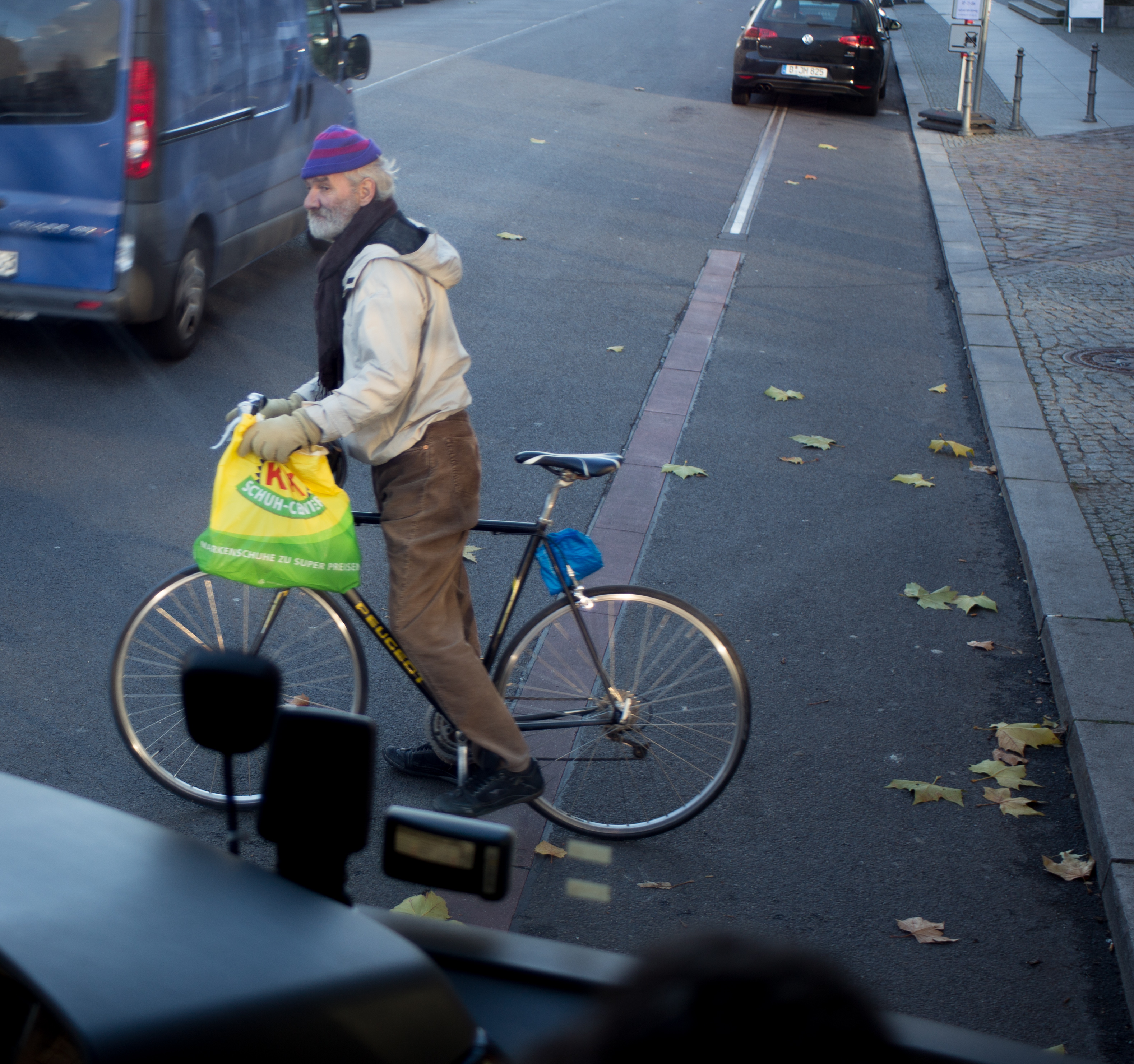 At first sight this appears to be a man with no head! Actually he is bending his scarf-covered head forward sharply in order to better read his phone.