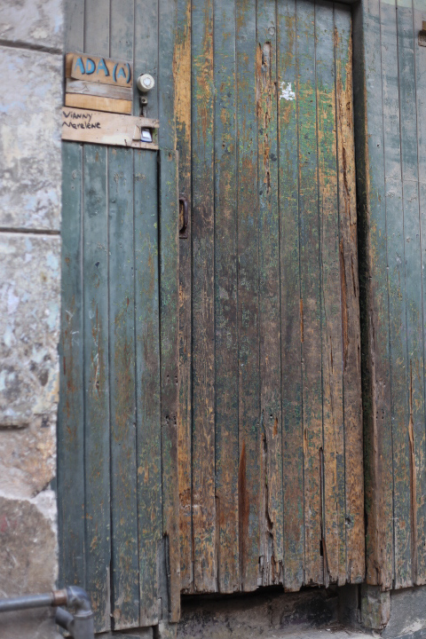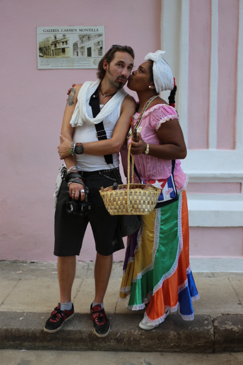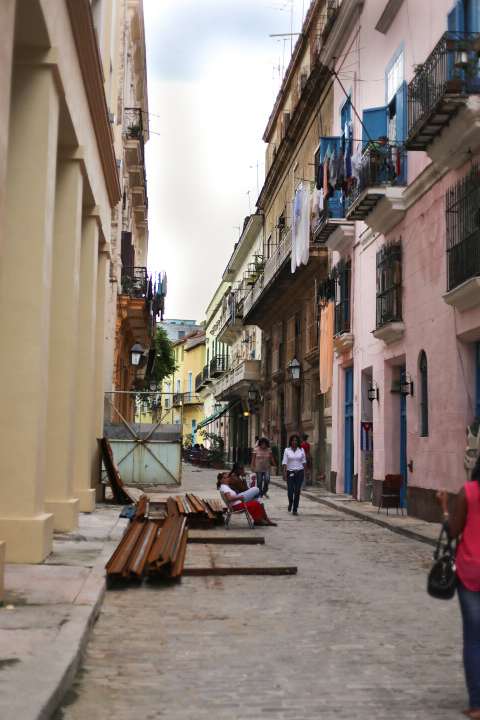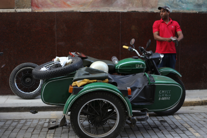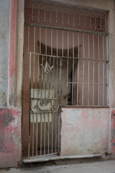 Why bother to paint a door when it looks as interesting as this one and still does its job. Ada in flat A has great style.There is a real divide between products for sale to Cubans and those for tourists, even separate currencies, the Cuban shops are sparse and dark with only whatever happens to be available that day for sale. These shops are not for tourists, there are dual currencies inCuba, the Cuban Peso for locals and the Convertible Pesos for tourists, (CUC) There are 25 pesos too one CUC, £1 will buy you around 1.5 CUC. Havana has been immensely wealthy at various times in the past, here is sad evidence of grand colonnial architecture suffering from neglect.Streets artists draw their surroundings for tourists and ask just a few pesos for their work.A city of contrasts, as in any place anywhere, it is most striking between the old and the youngWomen dress up in more-or-less traditional colourful costumes and parade around often with a large cigar in their mouths, hoping that tourists will offer them a few pesos to take their photos.Revolution Square, a vast empty square – plenty of space for the tourist coaches in high season. The vintage cars chase each other around the square, showing off their shiny curves in front of the iconic face of Che Guevera keeping lookout above.These restaurant workers have come outside for a well-deserved breath of fresh air, the two men are oblivious but the woman is understandably unhappy that I am taking their photograph, though I had tried to be inconspicuous, shooting from the hip. She’s too canny for that to have passed her by.Every house has grilles over the windows, often intricate and delicate-looking designs. The windows are rarely glazed but have internal wooden shutters.Here the metal bars have been adapted to fit the space to be secured. Frequently there are door sections too and even space cut out for air conditioners.Vintage cars are highly prized possessions passed down through 3 generations. Emilio runs his grandfather’s car, bought new in the 50’s as a taxi/sightseeing service, he says its a nightmare to keep it on the road, its so hard to get parts but the body and upholstery he keeps in good condition. The petrol consumption is huge, hence the prices the tourists must pay, though a half hour trip is still a bargain compared to London fares.A typical street in old Havana, regeneration is painfully slow, materials abandoned and rusting in the roadway.This guy polishes his vintage motorcycle which provides him with a livelihoodBicycle taxis abound, ad- hoc constructions made from recycled metal components and topped off with jaunty awnings to protect the passengers from the midday sun.Muh of Havana is built on the pattern of houses in a block built around a central courtyard, here filled with smoke from an open fire.Dawn from the roof-top pool of one of the hotels in central Havana which have been re-vamped for tourists demanding international standards of amenities.There is a vast divide between the sumptuous surroundings on this roof-top and the palpable material poverty in the streets below.