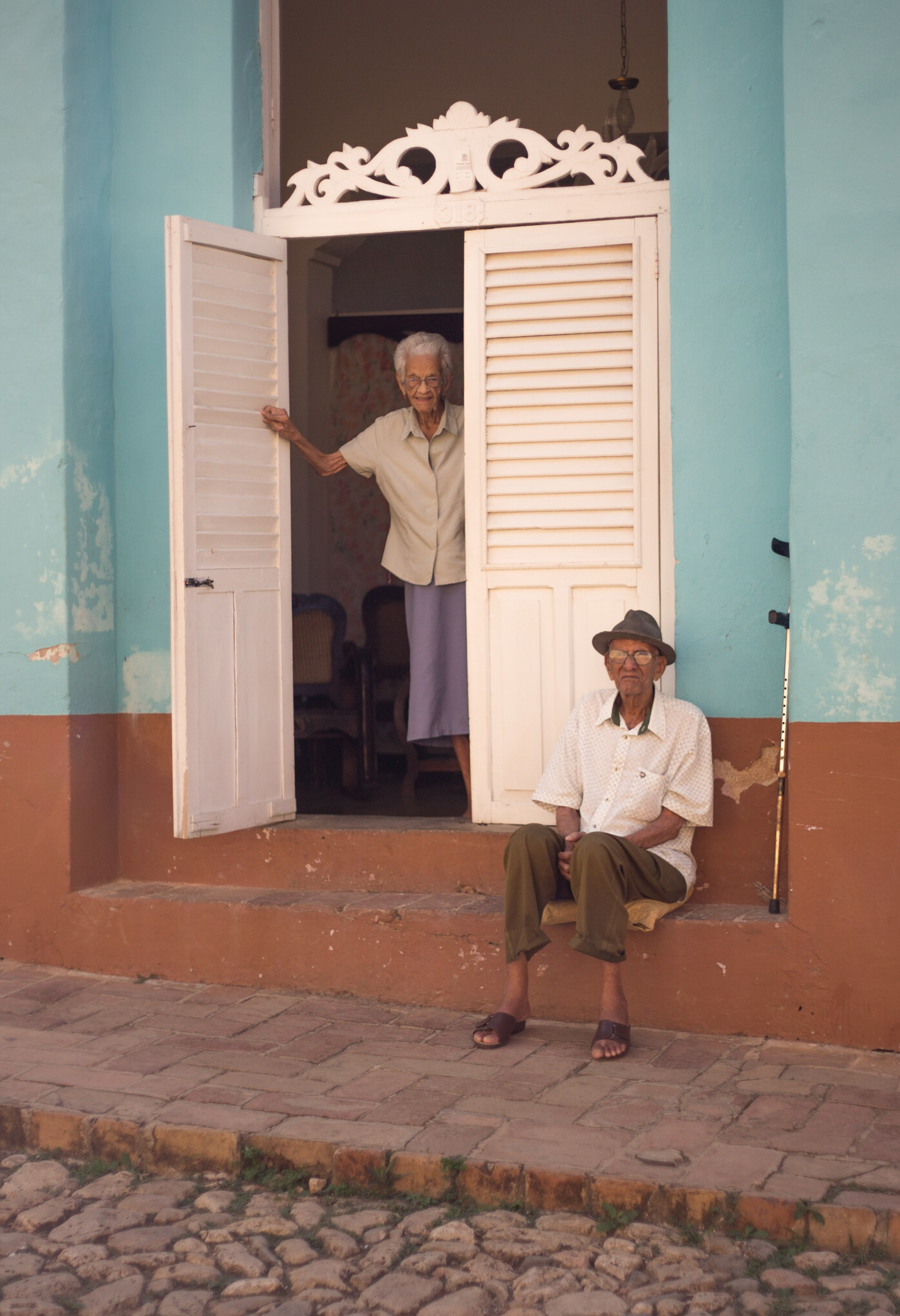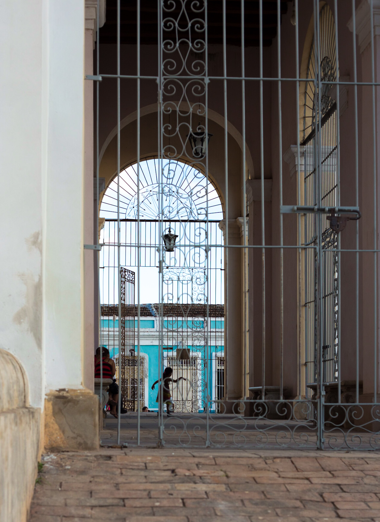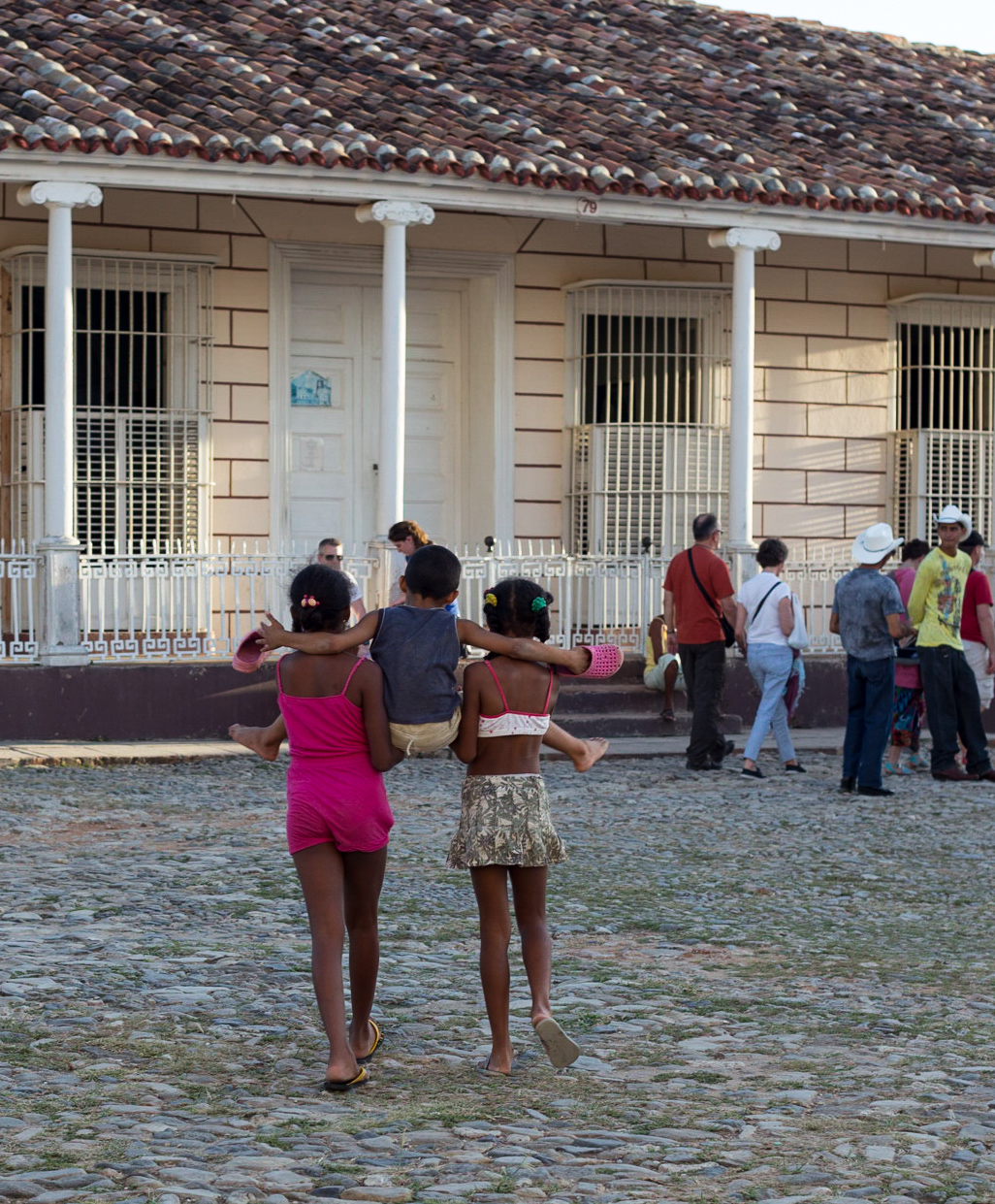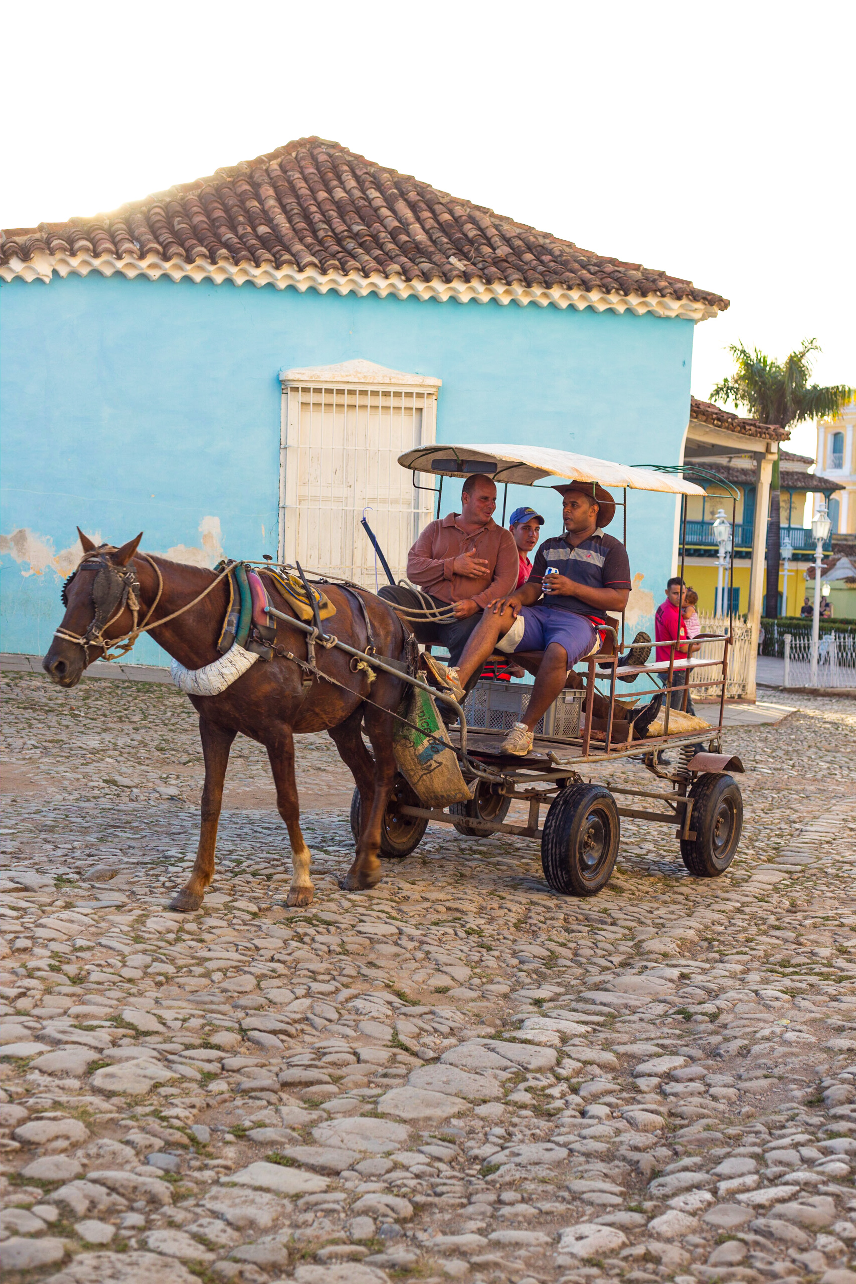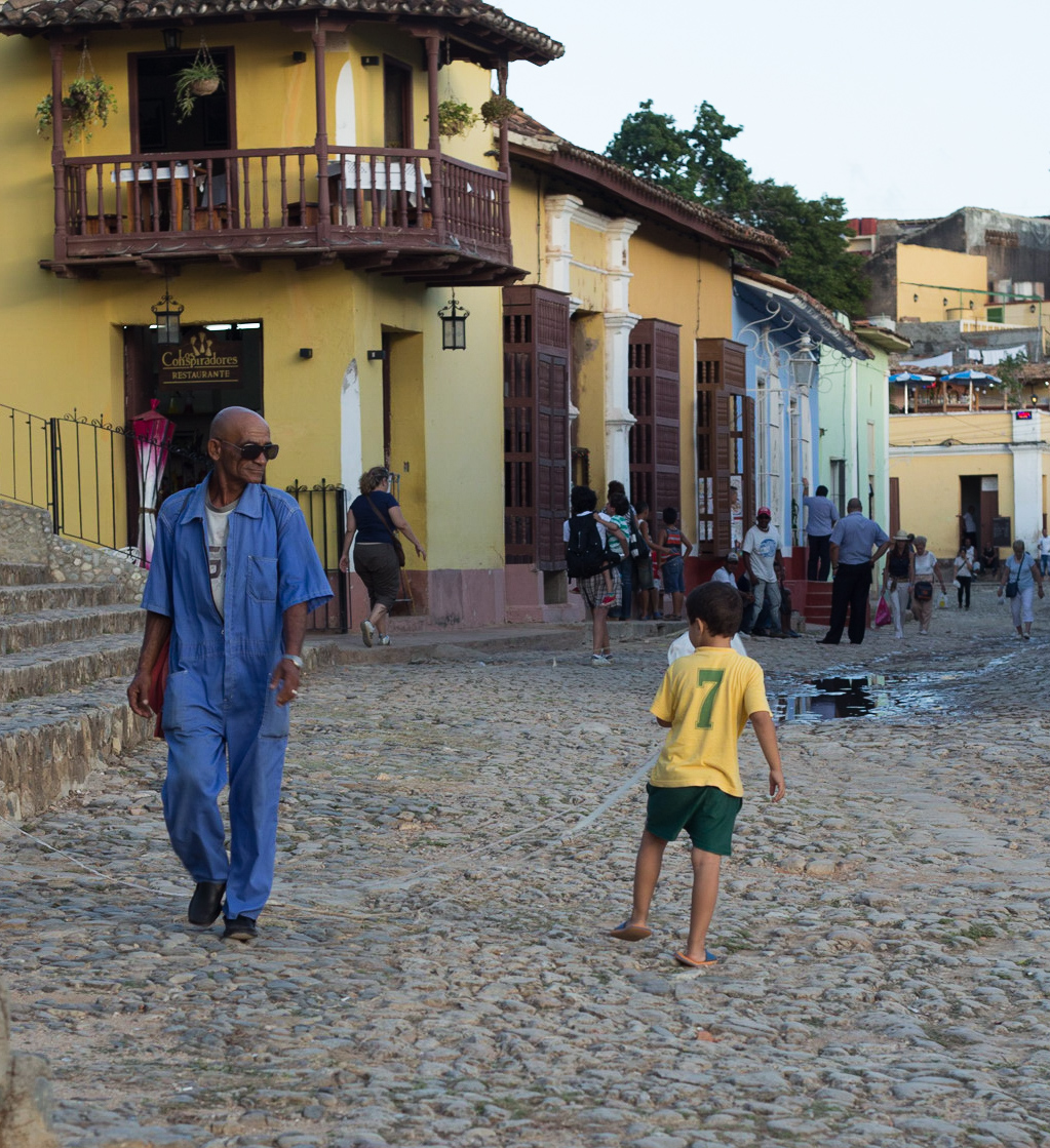 The band Grupo Ensueño in a restaurant playing for us whilst we ate delicious pizza.A man teaches his son to play guitar on the steps of the church just before sunset.He sits outside watching, she stays inside and pops out to check on him every now and then. He sits there only in the afternoons after the sun has moved around.A typically colourful street scene in Trinidad, most houses are painted in bright colours, it looks vibrant and bold not at all cute.Horse-drawn carts are a common sight, hooves clanking on the cobbles and with a cloth canopy to provide a patch of shade.Wandering the streets I came upon this iguana sitting on the edge of the road, I was cajoled into taking its portrait along with its owner. I was stupidly nervous of the creature, it’s skin looked unpleasantly both papery and greasy.The shady side of the street painted blue by the flowing water.