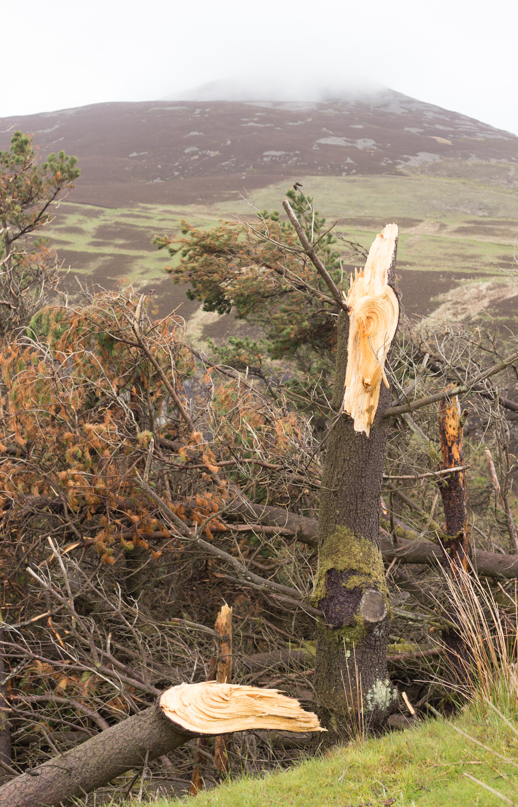 At some time in the last few months the rain and wind caused havoc in an area of Forestry Commission pine forest on the ridge near Nant Gwrtheyrn, the pines cling to the steep slope on the north of the road but a combination of heavy rain and gale-force winds caused trees to loose their grip and become uprooted and many trees to actually snap. Whole hillsides have been devastated, wrought asunder.
