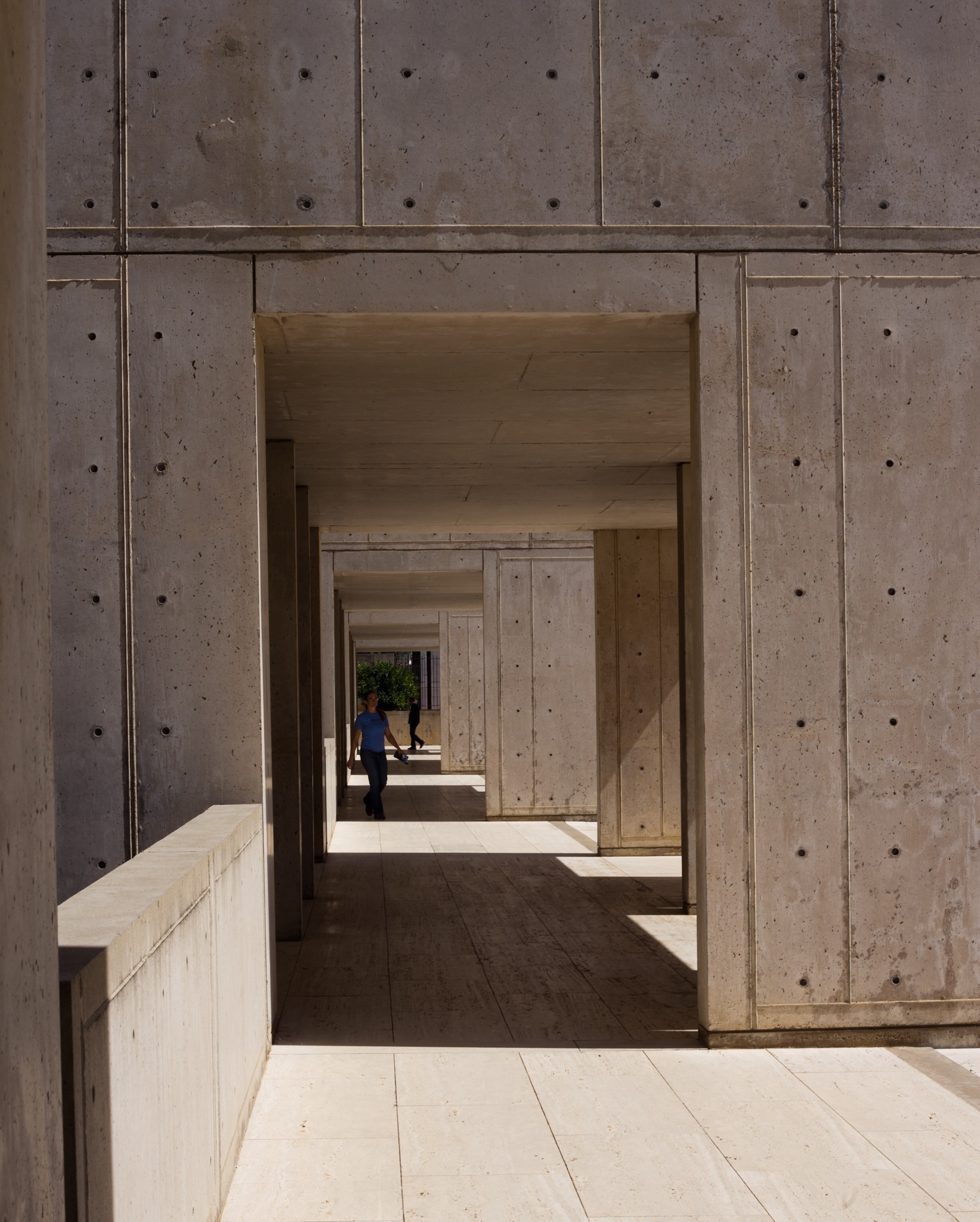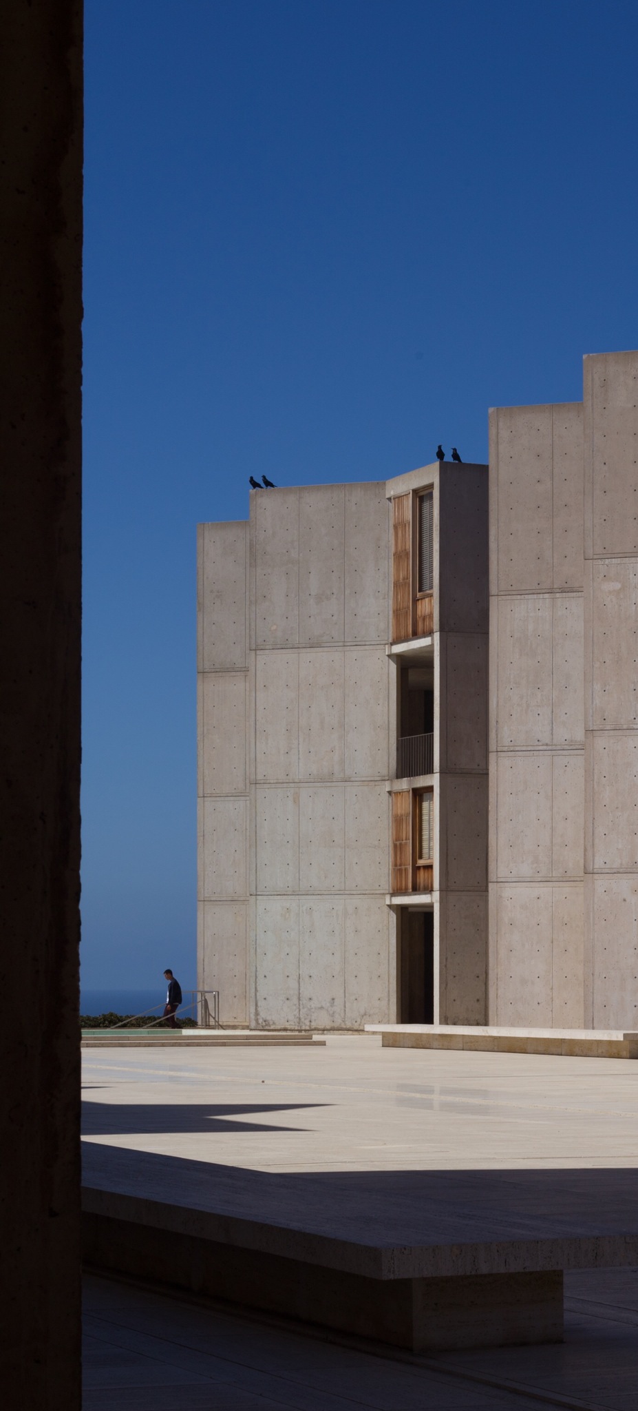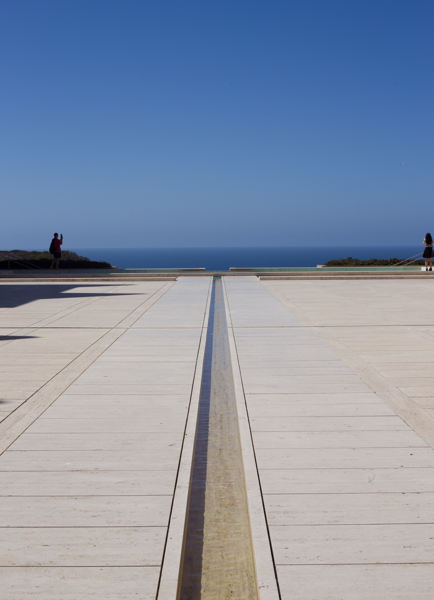 The Salk Institute building perfectly suits the bright clear skied climate of Southern California. The ratio of positive to negative space is 50:50, the positive being regularly interrupted by views across, through and out toward the sea. The rectangular courtyard draws one back again and again, the subtle leading lines of shallow channels, raised edging on cast concrete, travertine marble benches combing to make a contemplative thoughtful place.