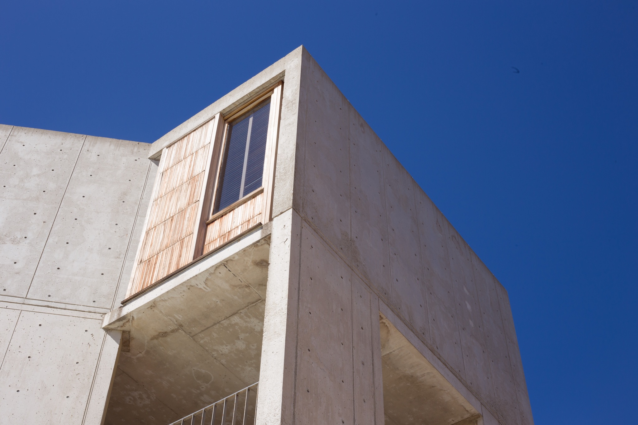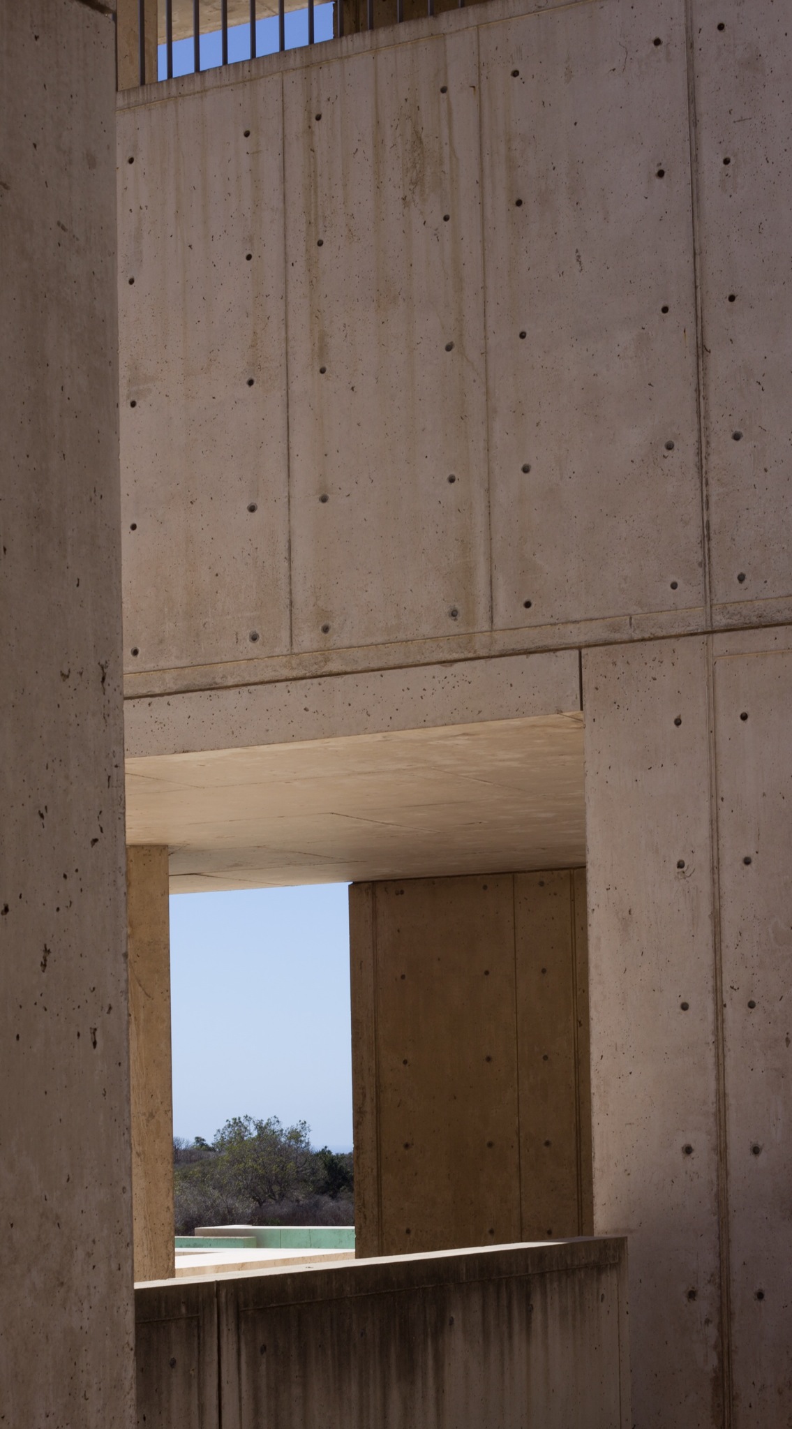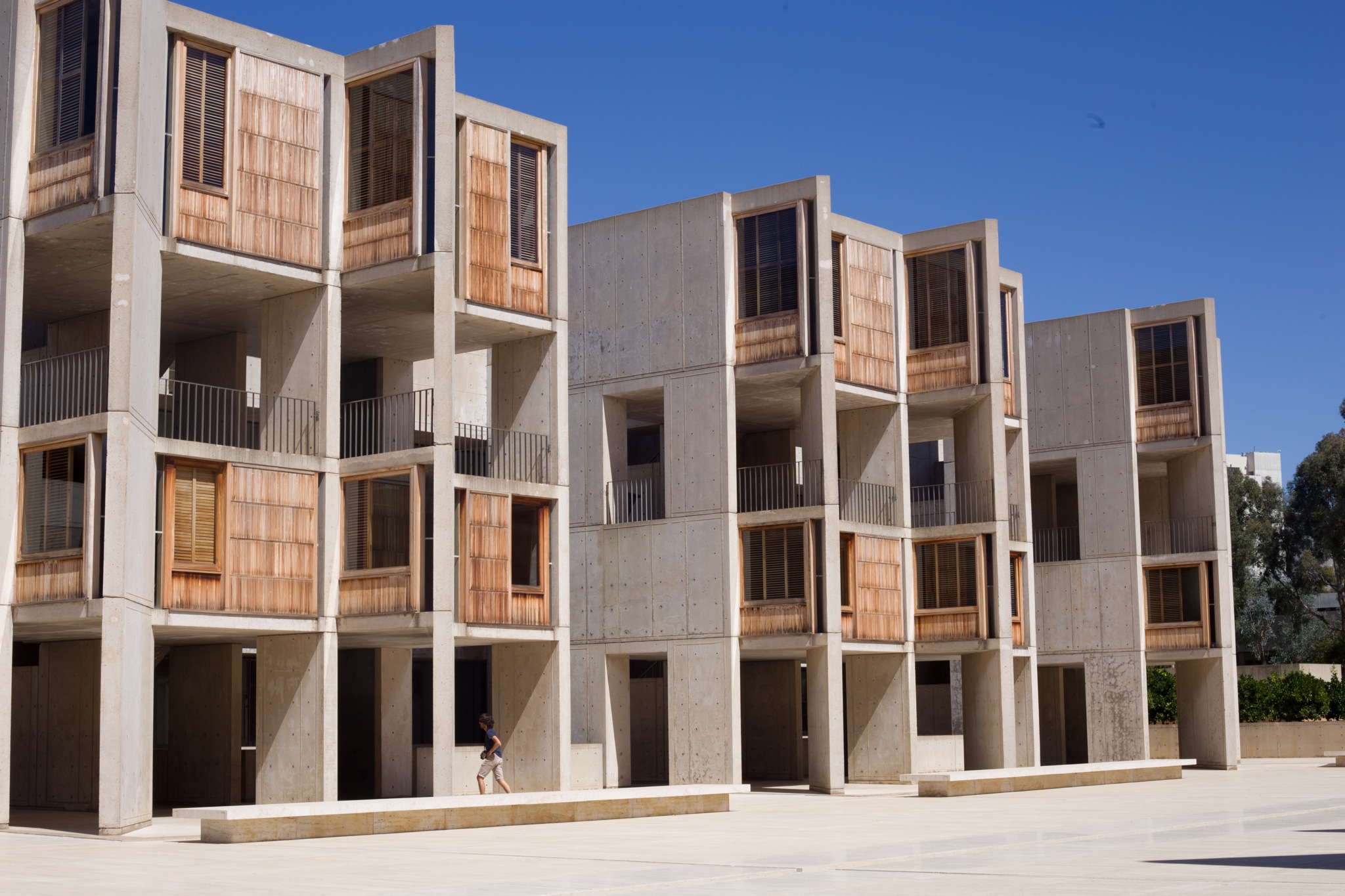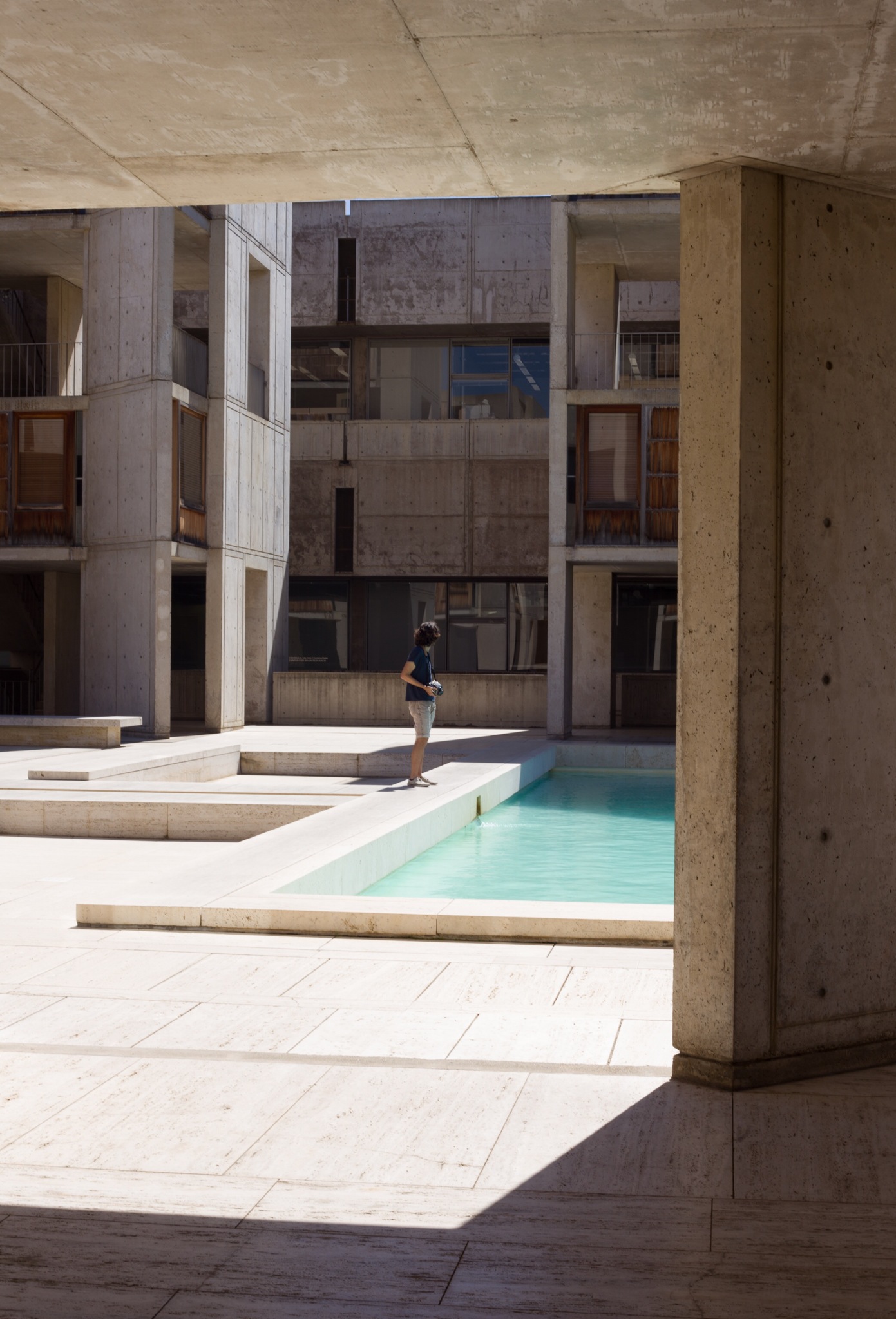 The Salk Institute building perfectly suits the bright clear skied climate of Southern California. The ratio of positive to negative space is 50:50, the positive being regularly interrupted by views across, through and out toward the sea. The rectangular courtyard draws one back again and again, the subtle leading lines of shallow channels, raised edging on cast concrete, travertine marble benches combing to make a contemplative thoughtful place.