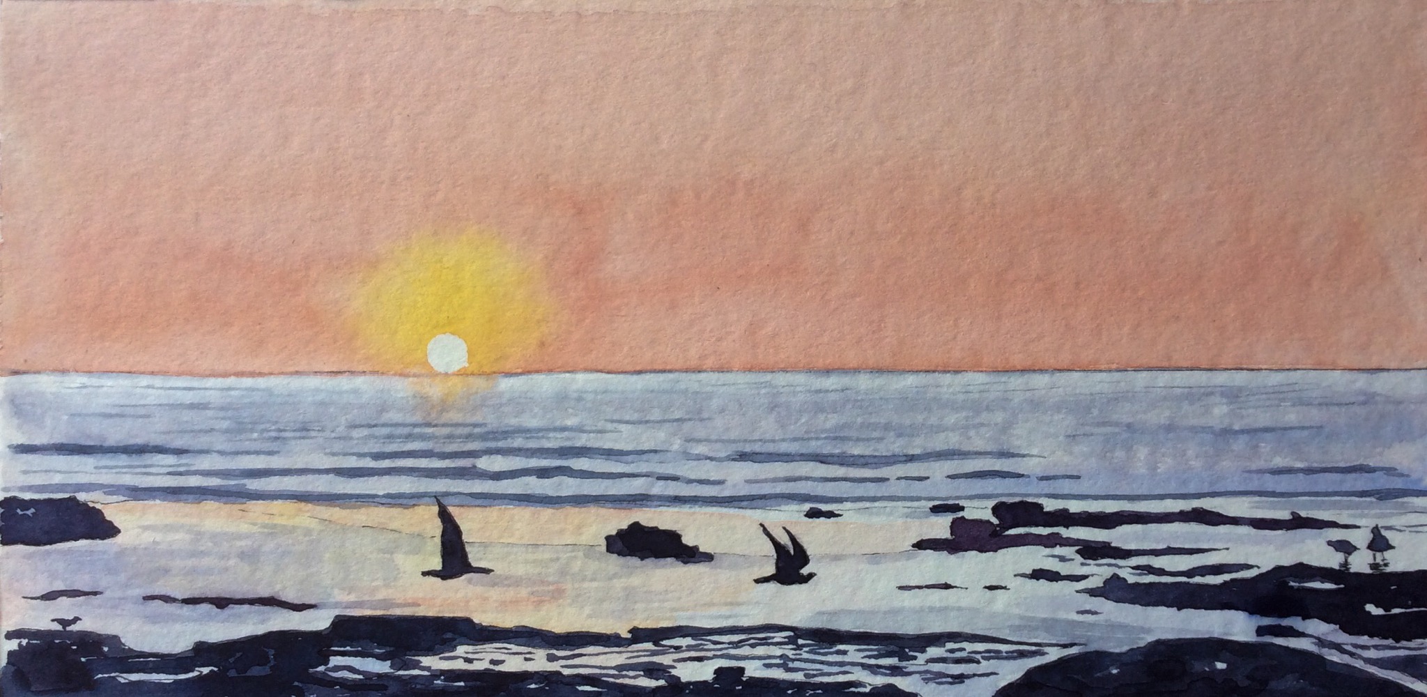 The painting needs some more work, more dark details in the water and if I dare risk it, a light pink wash over everything, (should have been done first of course).