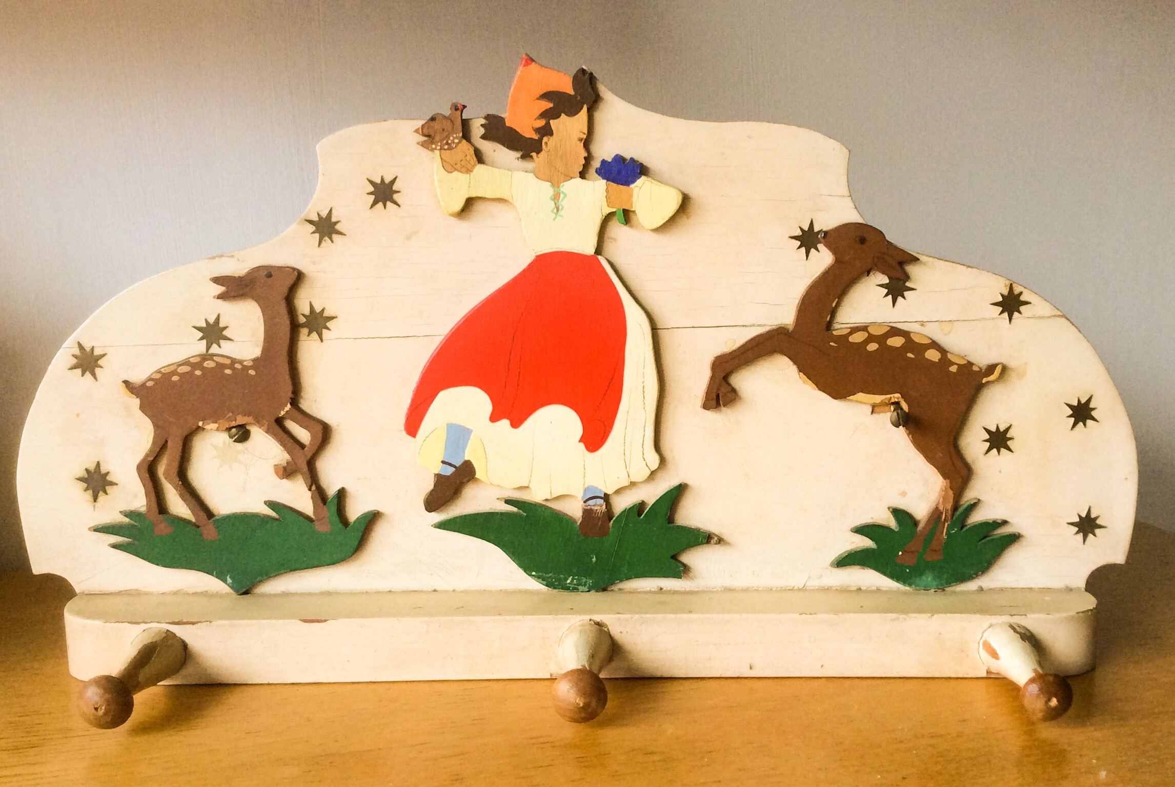 I’ve had this little thing for as long as I remember, but I have no idea of where it came. It’s only about 35 cms long, made from painted ply-wood with little glued on metal stars. There’s nothing on the back other than some pencilled numbers and the remains of some glue where it was at one time stuck to a door. I’m tempted to think that it’s home-made but the edges are very smooth as though the shapes have been milled not cut by hand with a thin blade. The painted girl and her deer friends are hand-painted and with some fine detail. I wonder if the details are significant? The blue flowers in one hand, the dove in the other, the deer are curious not timid and the gold stars – is it night-time? I had wondered if the stars had been added at some later date but two of them are actually beneath the deer on the right.