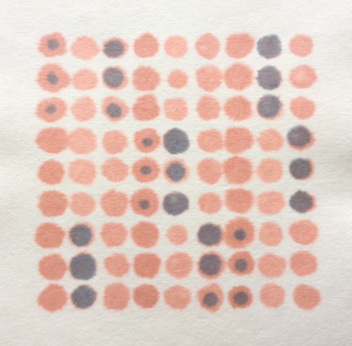 I found several more in the series of spot paintings I made back in 2011. These two are my favourites. They are based on mixing watercolour pigment washes in several strengths and then dropping, using a pipette, onto blotting paper in sequences. The colours were not mixed in the pots, they simply merged a little once dropped onto the paper.