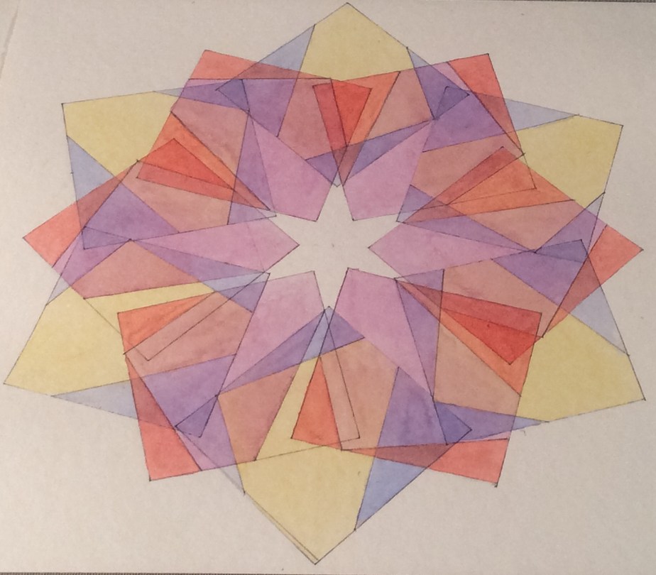 I really wanted to exploit the colour variations of the overlapping areas, I painted with watercolour using a different colour for each distinct shape, not the individual shapes formed by the overlap. The inside shape in each square is either Indian yellow or magenta, then the remains of each square painted either ultramarine blue or cadmium red. Each overlapped shape is then changed by how many colours are laid over it.