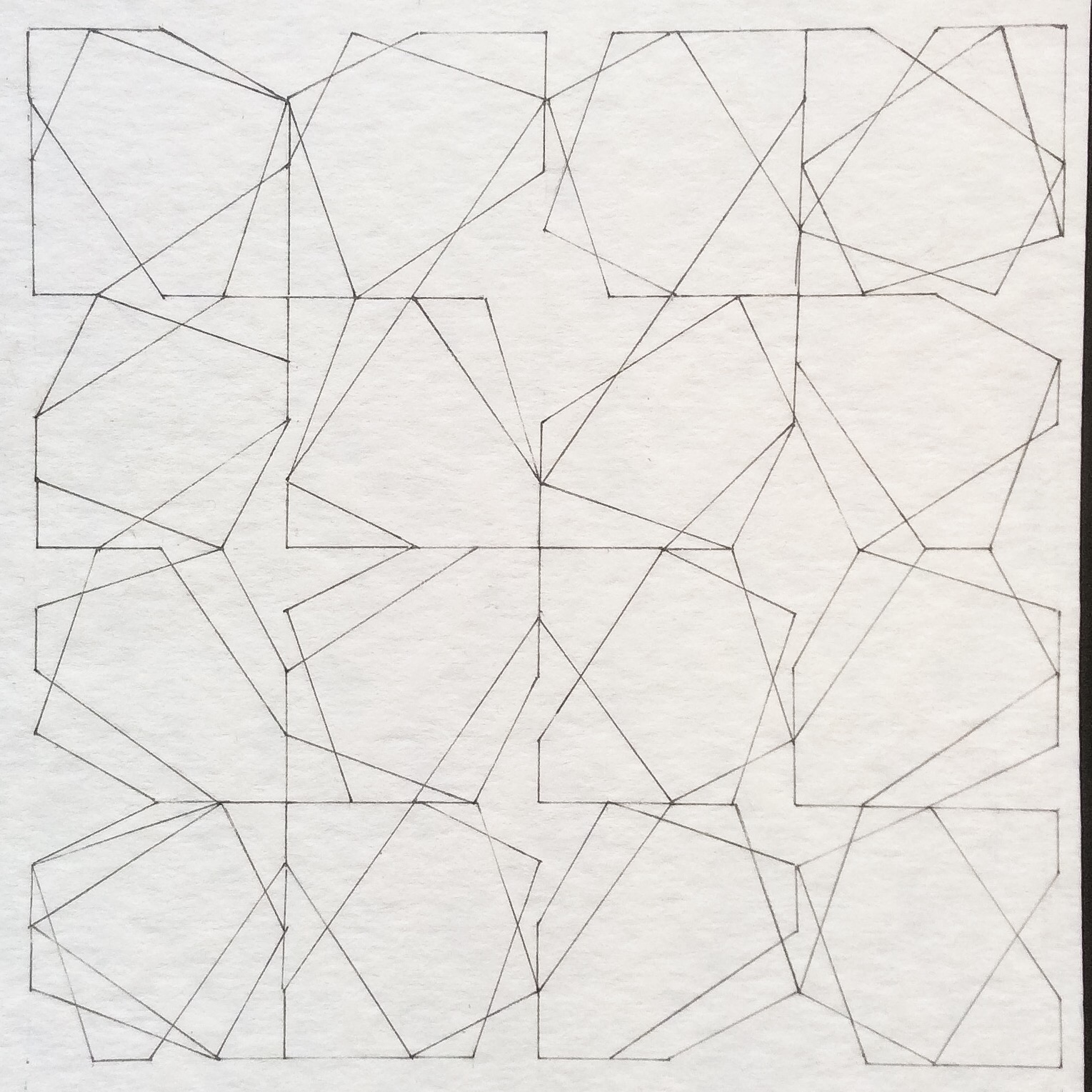 Superimposed on that layer are a sort of random choice of rotated or mirrored shape, not fully random as I did not allow the same shape as on the first layer. the top right and bottom left squares each include a third shape.