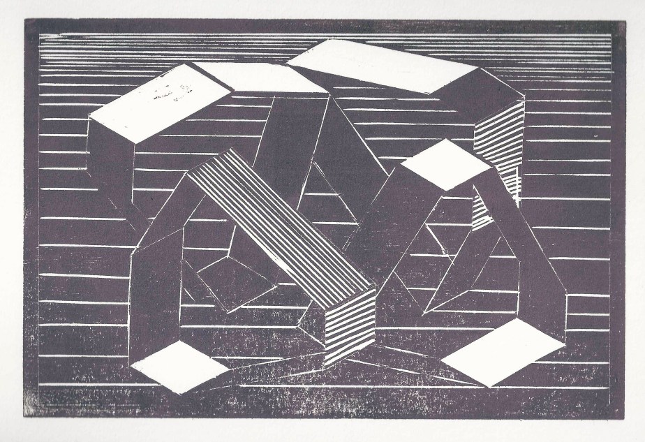 We began by simply making different kinds of marks using the various tools on a small block, just to see what it was like. Then we each made a block to our own design. This is my first block, after I had printed from it several times.