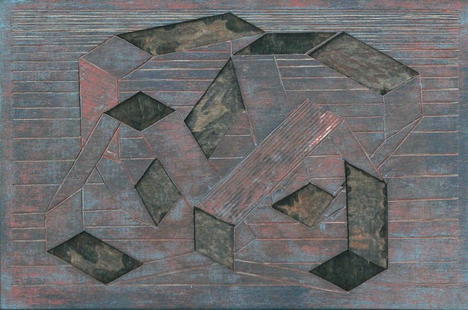 This is the first print I made whilst at the workshop, a two colour print, the vertical lines are on the back of the same block. I printed the dull pink first from the front of the block and then later the blue using the back of the block.