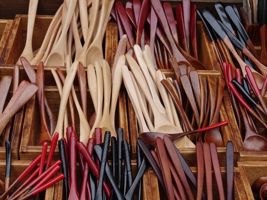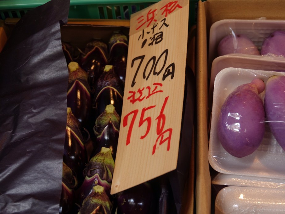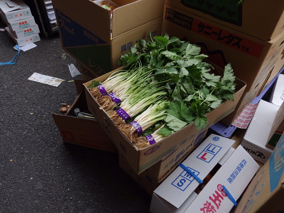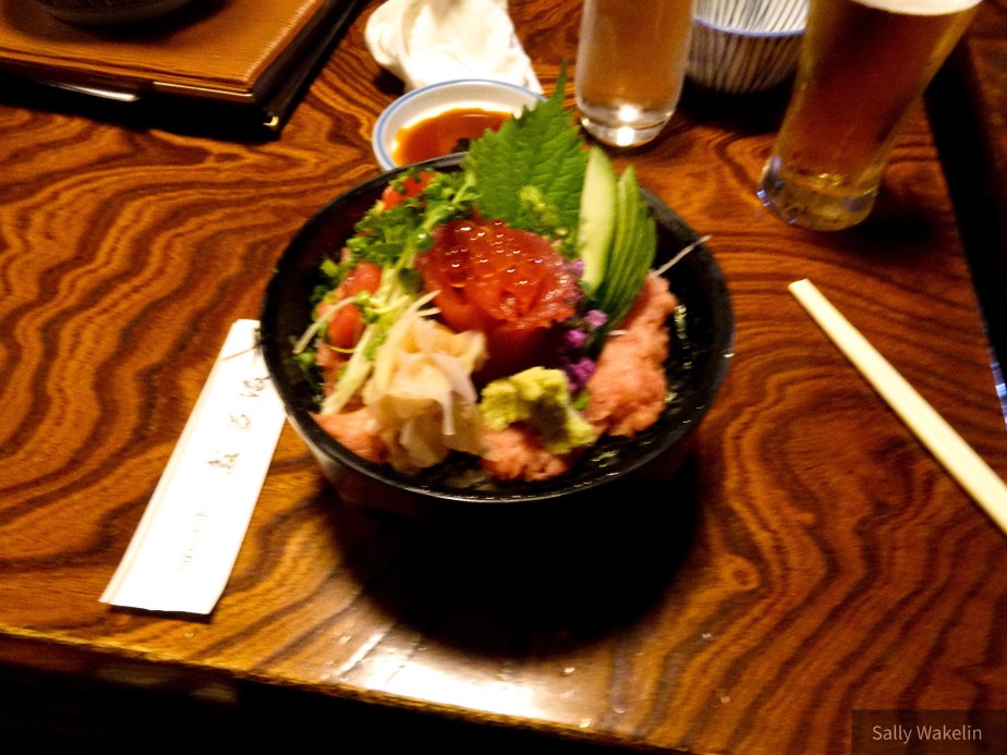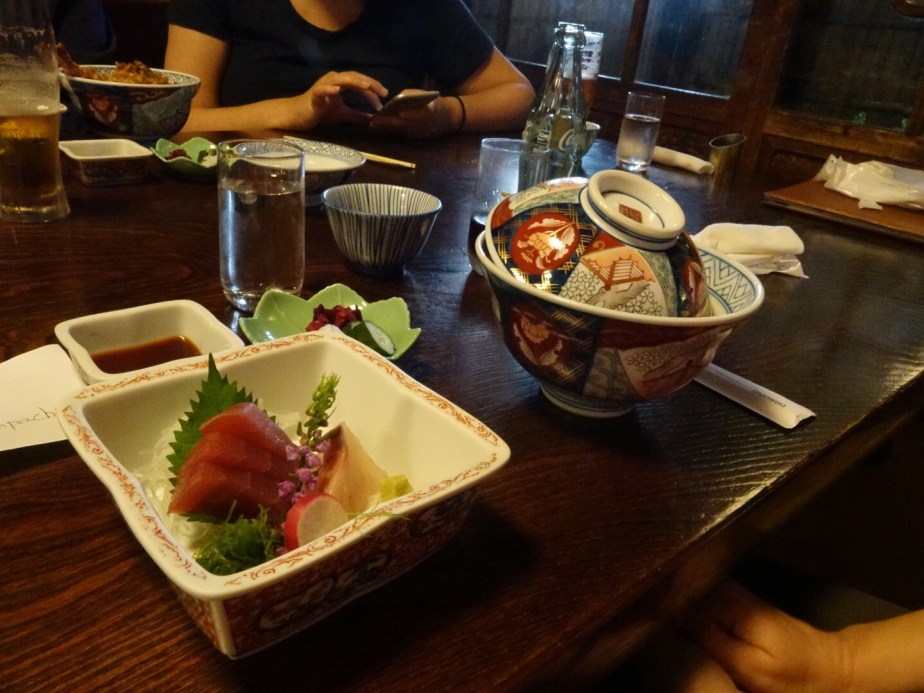 Mung beans I thinkBunches of very fresh herbs are everywhere, these are coriander.Or maybe these are!Little flower stalks are often laid on top of cooked food or sushi as decoration but are eaten too, they’re quite perfumed and have a slightly medicinal taste. As I understand it, they are flowers from a kind of mint or basil known as Shiso, the leaves are also used and are put on the plate, before the food.Shiso leavesWasabi roots sitting in water to keep fresh and cool. Their amazing flavour evaporates(?) extremely fast and in the best restaurants, its not only grated fresh every day but fresh for each served dish.I think these are a type of Okra, sadly I didn’t get to try them.Two varieties of aubergine than are readily available in the UK. Tiny deep purple ones and plum light mauve ones, used for different reasons, I suppose.The head of that day’s tuna, being kept on ice, to show how fresh the stall’s wares are.Asparagus, lovely fat spikes, at the height of the season in early October. Delicious as Yakatori, wrapped in bacon (very thinly cut Japanese style) and cooked on skewers over a charcoal grill – with a beer of course.Wooden spoons in a huge range of sizesJapanese cooking knives, a famous shop where they make the knives themselves and sharpen right before you buy it, to make sure it is ultra-sharp.All sorts of small china tableware, mostly chopstick rests and tiny dishes for wasabi, grated daikon, pickled ginger or soy sauce.A sushi and sashumi banquet, glorious. Three or 4 types of fish, mackerel, prawns, salmon roe, omelette and pickled gingerAnother fabulous meal or raw tuna decorated with cucumber and Shiso leaves and flowers, wasabi and radish, a bowl of miso soup waiting with its lid on to keep warm. Soy sauce and pickled plums in the dishes at the back. Pickled plums are a revelation, so delicious.Horribly out of focus, maybe beer had been taken already. A massive dish of minced raw tuna, of the best kind, there are three types, the basic tuna which is most likely cooked, the middle tuna which can be eaten raw or cooked and the best kind which is much higher fat content and most usually eaten raw. Then a large dollop of salmon eggs plus the usual decorative edible additions. There is some rice under there somewhere too.An unusual restaurant in Tokyo in that everything is specifically organic, free range, all sources known and a high proportion of vegetables. Here are tofu, toast with pate and fried sweet potato, as well as couscous with herbs and mixed salad of lettuce, beetroot and chicken.Part of a 7 or was it 9 course banquet at a hotel in Hakone in the mountains. Sadly I didn’t keep the printed menu (in English) so I don’t know exactly what any of it was. There were some gloriously unexpected tastes, not all of which were palatable but mostly they were utterly delicious. I can recognise raw tuna, raw white fish, maybe sea bream, cucumber, radish (the red slice under the tuna), wasabi paste, a daisy? the white rectangles are bamboo shoots, I think and theres a Physallis in its papery outer layer at the back.Another banquet at the restaurant used in the filming of Kill Bill. A huge noisy, crowded, theatrical place with excellent food cooked to order on massive grills right in front of us (to the right in this shot) We saw a famous Sumo wrestler there, he needed four chairs, two at the back and another one under each leg.And finally – street food, there are tiny kitchens all over Tokyo and Kyoto serving first quality rapidly cooked to order food of many types. In this one you can sit at the bar and in others you just take away. Also no-one throws away any rubbish, the packaging/containers are either left at the stall or taken home. Public waste bins are few and far between, as it is understood that each person deals with their own waste. It makes for incredibly clean streets.