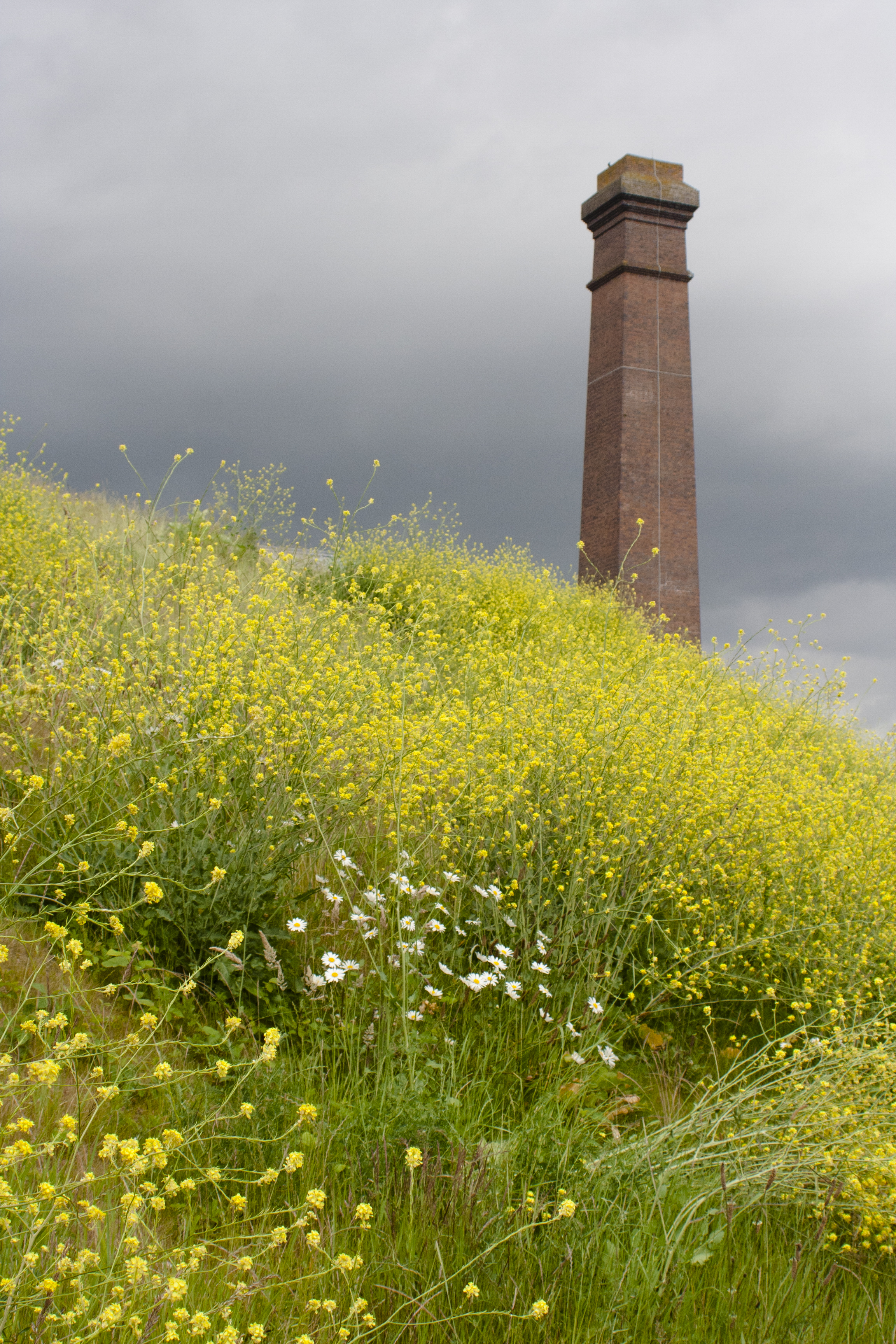 A crop of some wild, persistent and fantastically yellow flowers made a striking foreground for the pewter coloured lowering sky and the old brick chimney stack.