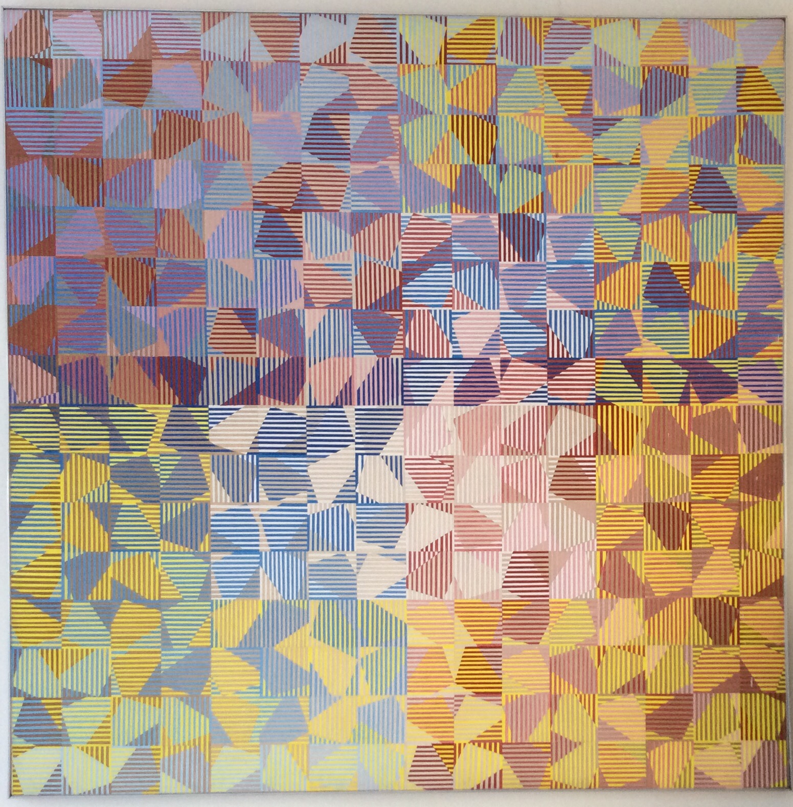 A painting by my mother dating from the early 70s, it is 1.4m square and hangs on my living room wall. The pattern is based on a complex series of rotations and mirroring at more than one level as well as another set of rules governing the colour changes. I’ve spent many hours trying to decipher the rules and have made progress but there is still some areas of mystery.