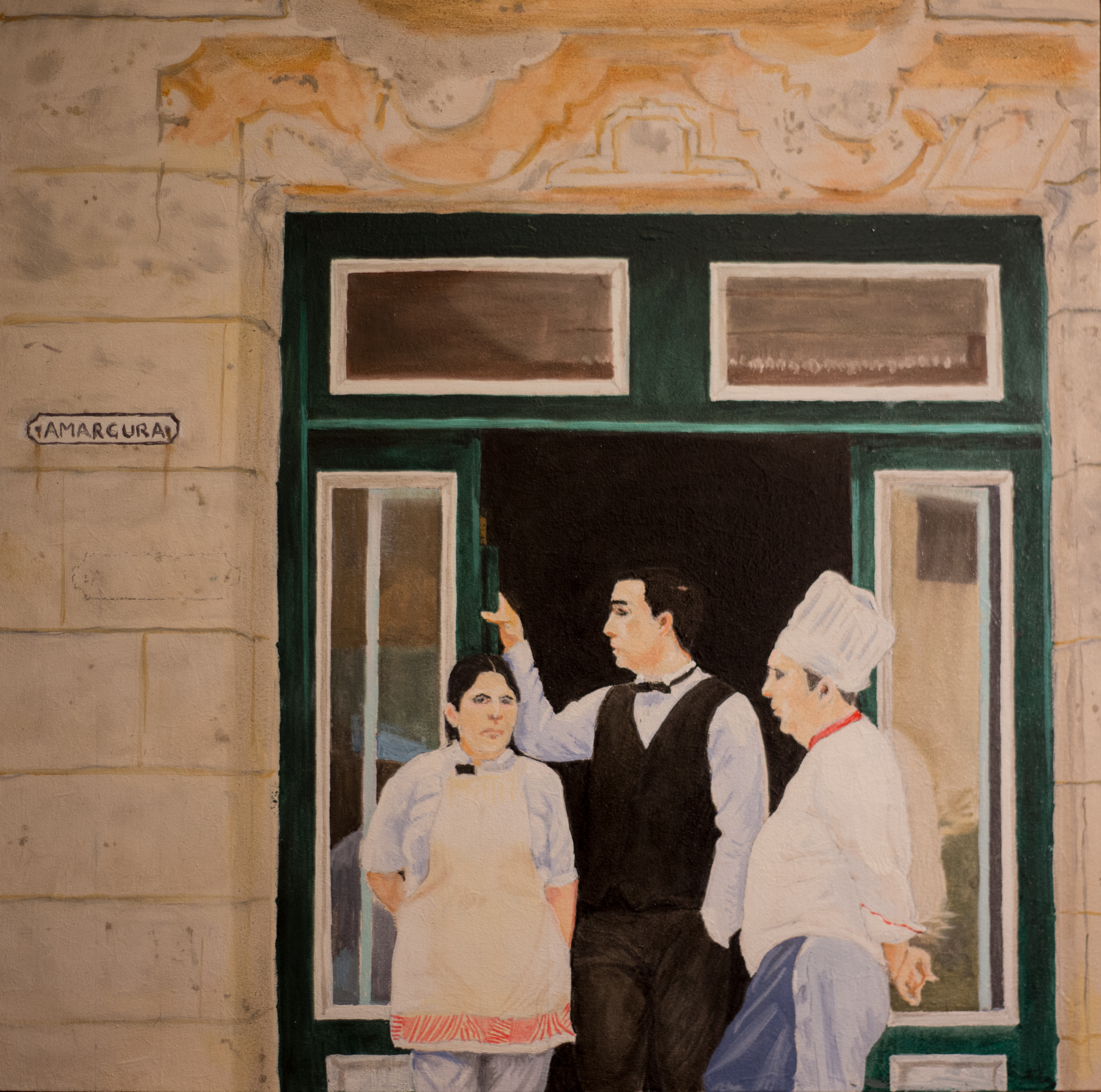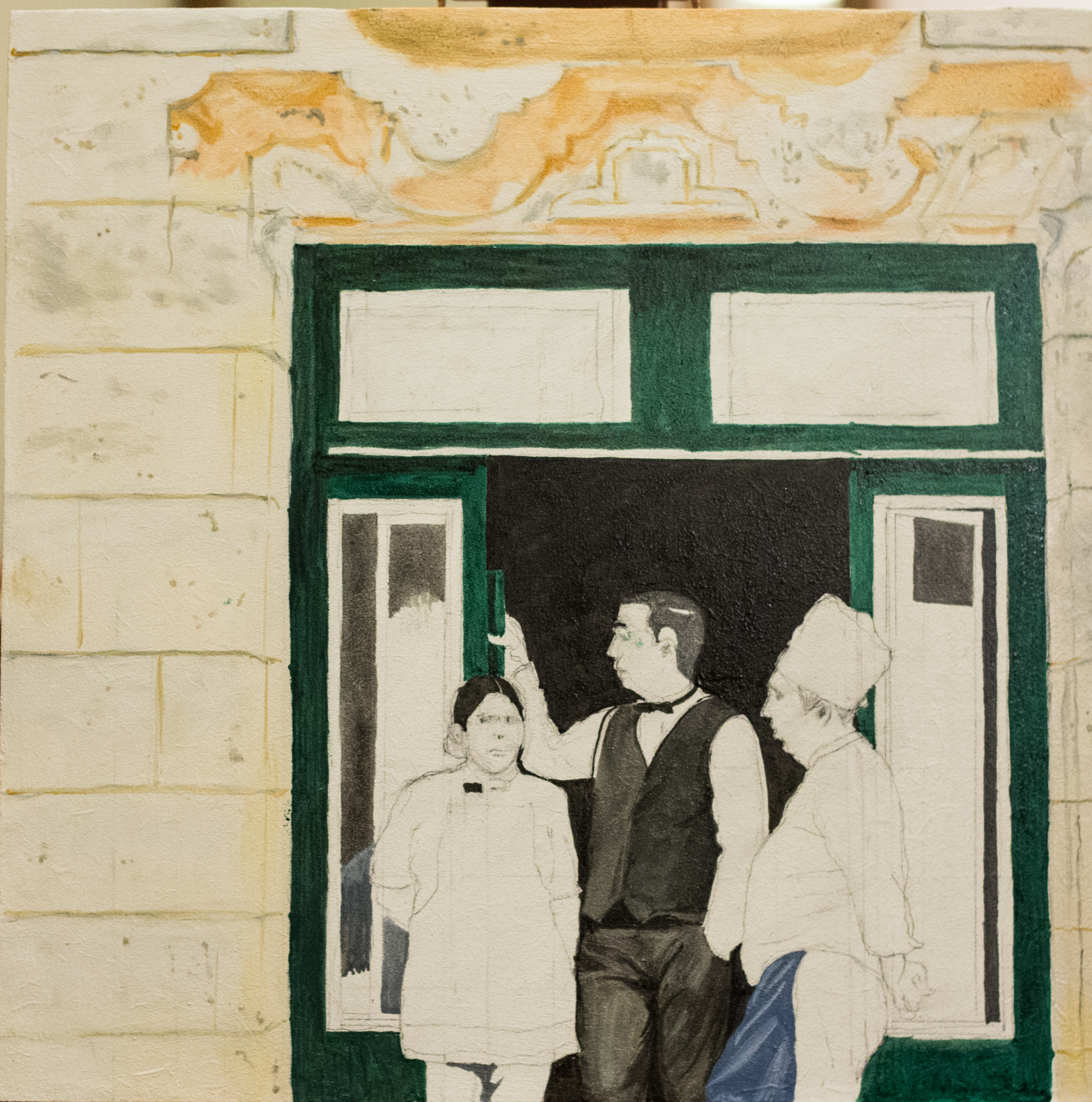 I’m taking a break from painting the portrait to let the oil paint dry for a couple of days. Here’s what I’m painting instead, three restaurant workers taking a break before the lunchtime rush in old Havana, Cuba. I was aiming to take the photograph without them noticing me, shooting from the hip but the woman caught me, though she didn’t seem to mind too much. I have just laid in the first colours, lots more detail to fill in. Its a small painting, only 30x30cms.