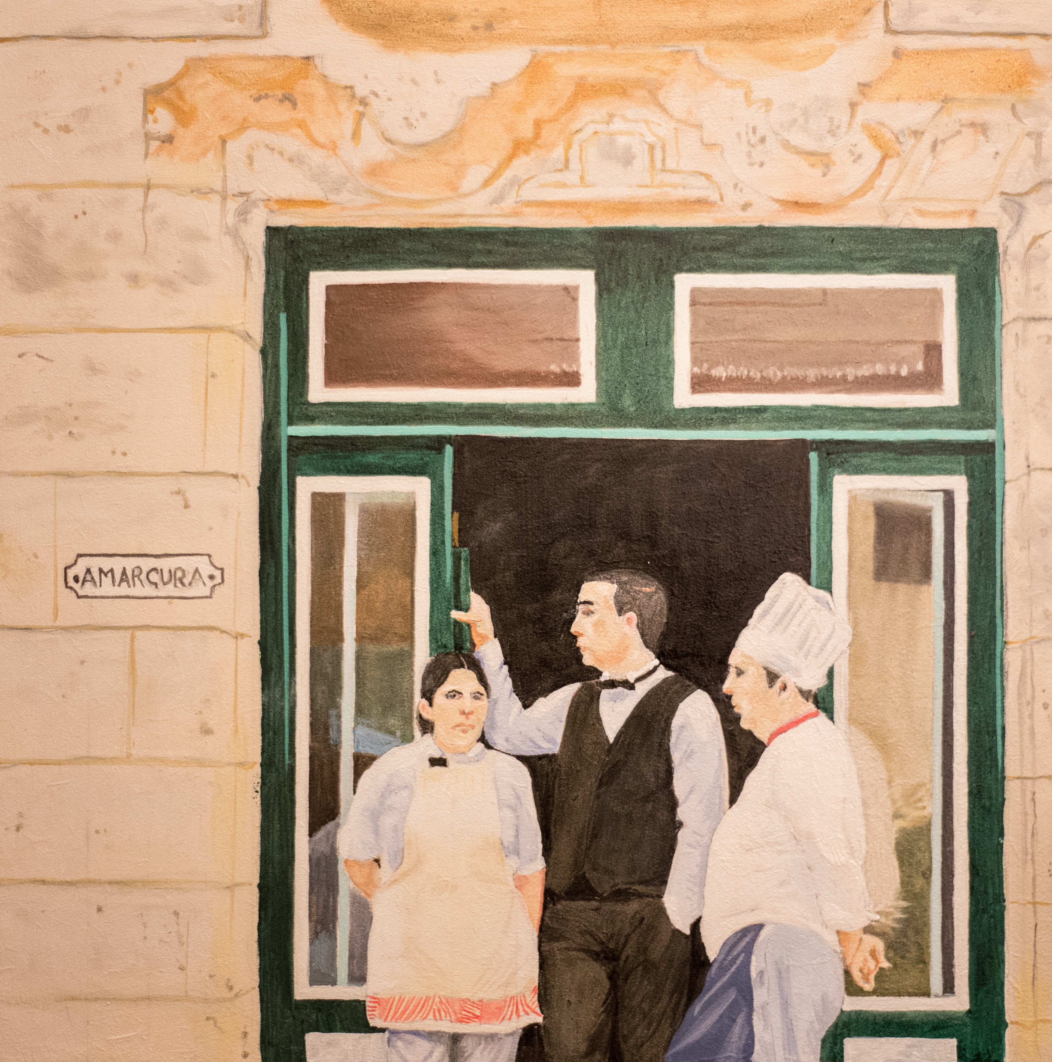 I was struck by their expressions, a mix of boredom, anticipation of the hard work to come during the busy midday period and their suspicion of me taking their photographs. They made such an interesting composition, the two men looking over the woman’s head, the pot-bellied chef’s whites stark against the dark background, that same darkness almost engulfing the taller man, concentrating the eye on his upward-pointing arm resting on the door frame.
