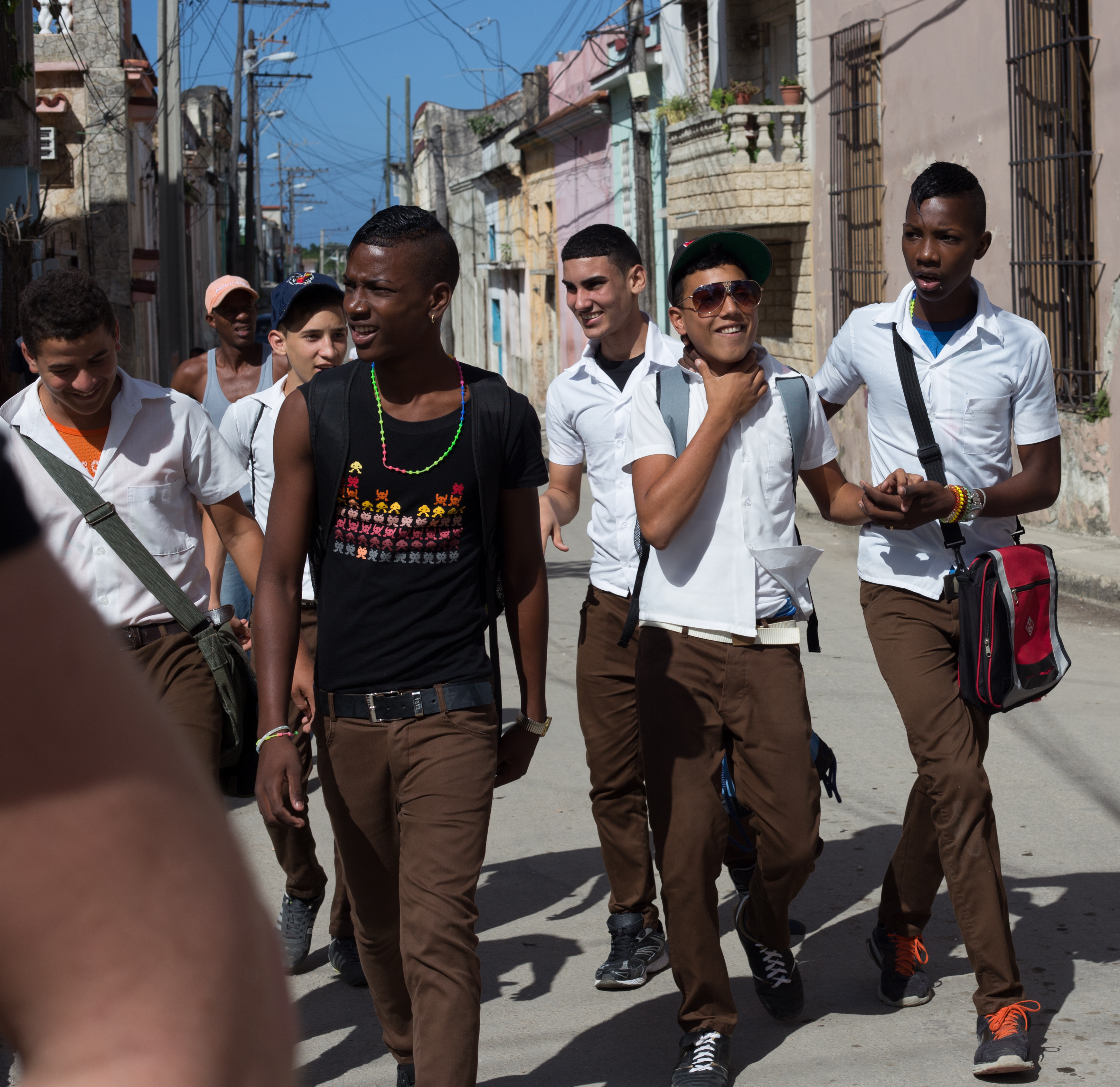 The young men in uniform (personalised of course) making a racket on their way home from school, look so irresistibly vibrant. The photo was taken in one of the poorest districts of Havana, Cuba where every child has free education and uniforms.
