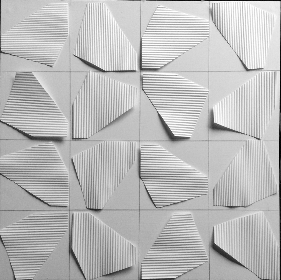 Playing around with a system of rotation and reversal of a simple shape, I corrugated the paper cut-outs which adds an element of chance in how the light falls, the pieces are not attached and naturally curl up in random ways. Half the cut-outs were corrugated top to bottom, the rest side to side. Of course the corrugations shortened the lengths so the pieces no longer fill the squares properly. For a few moments this looked wonderful in strong sunlight but now it’s cloudy again.
