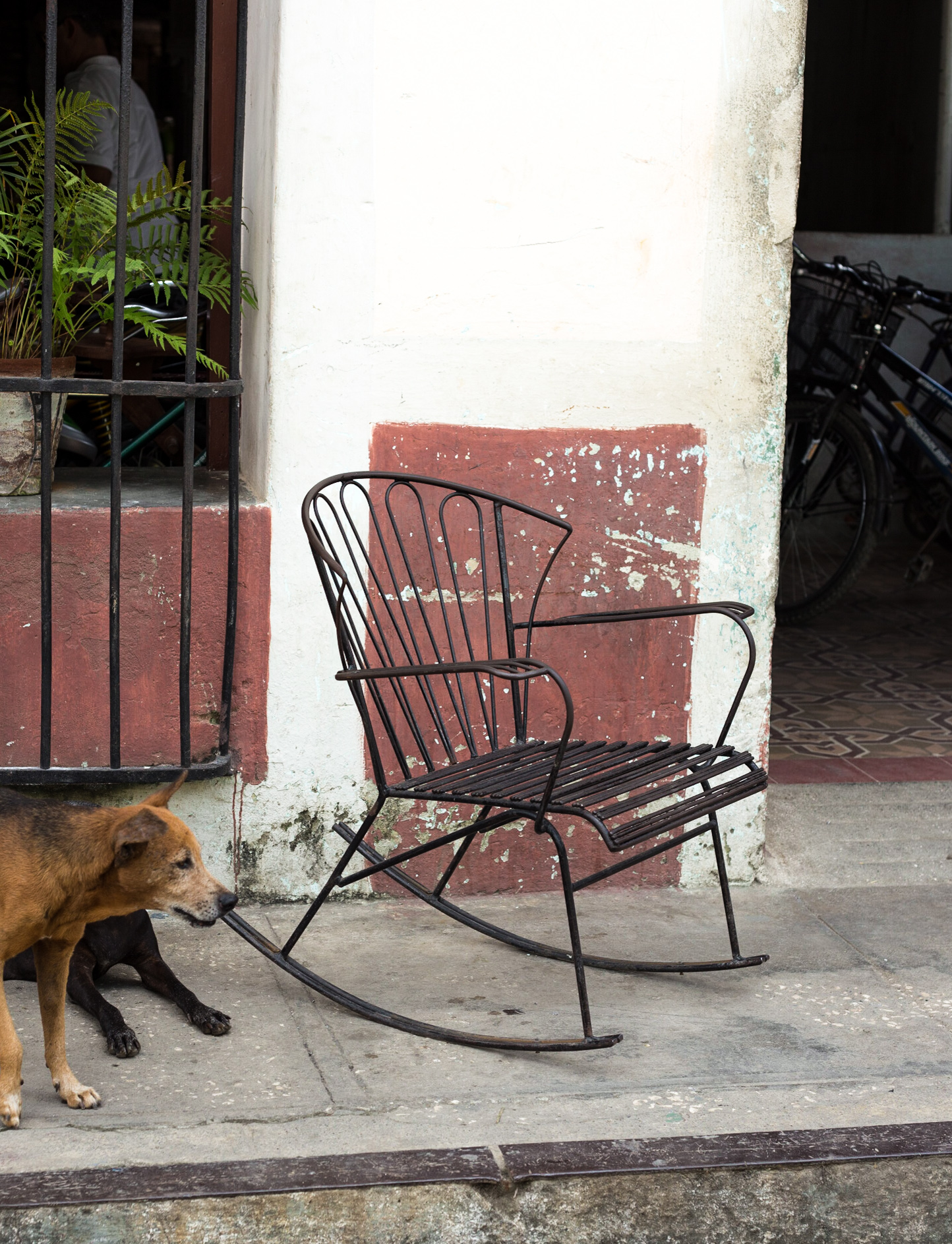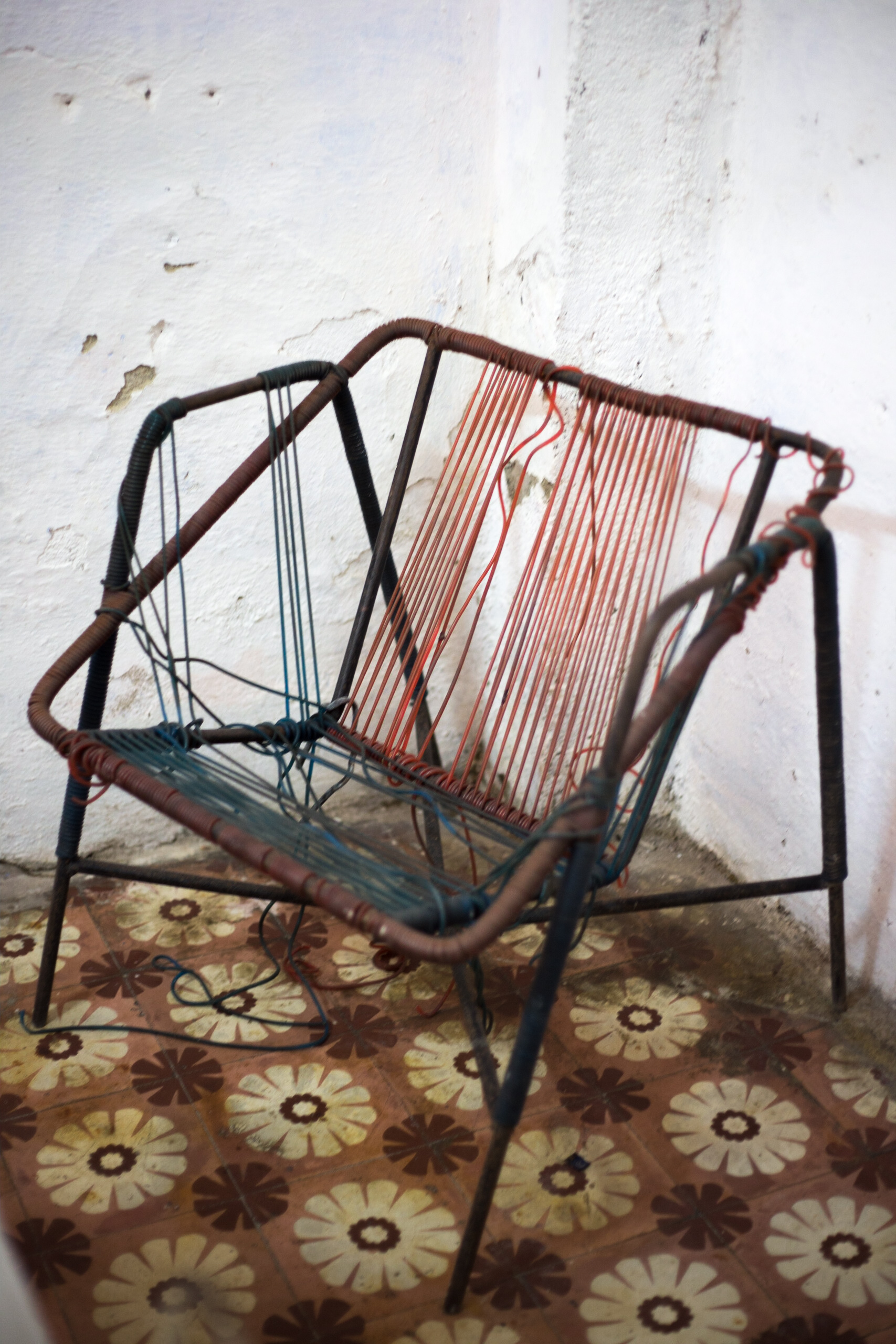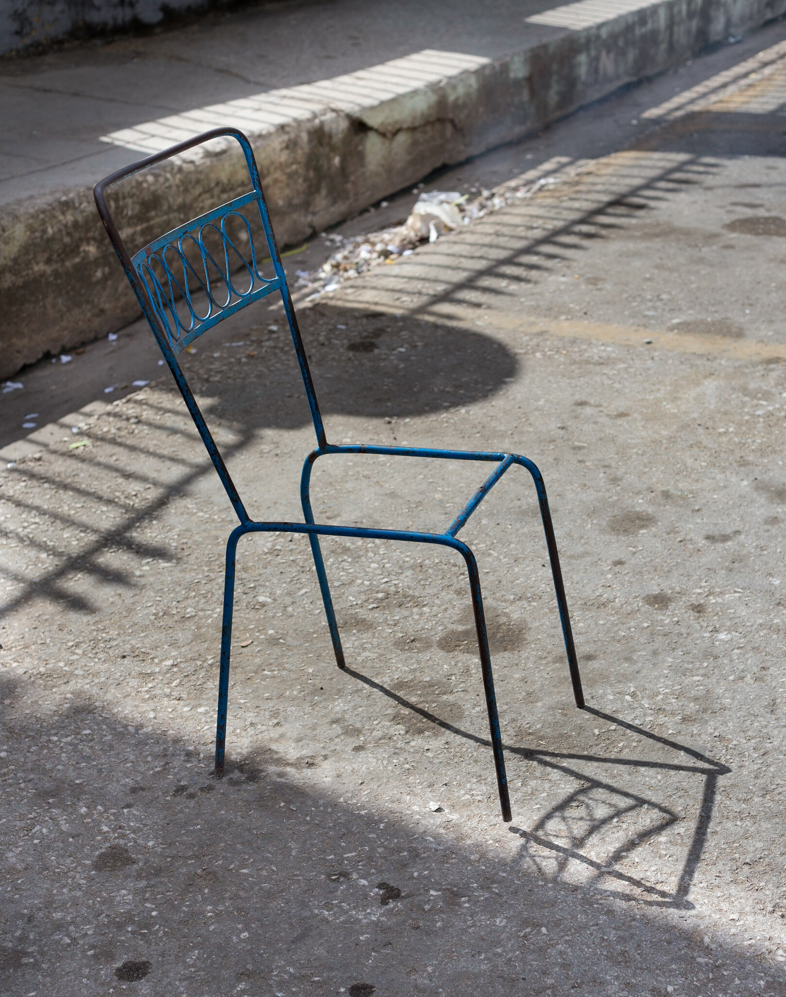 All around Cuba people sit outside their houses or businesses, taking advantage of any wafts of cool air. People sit on steps, boxes, curb-stones, wooden stools and if they’re lucky, a favourite chair. Often these chairs look like home-made affairs, ingeniously bent lengths of rebar or other steel rod, forming a basic structure sometimes adorned with flourishes. They are mostly very old, worn, re-painted and above all, well-used.