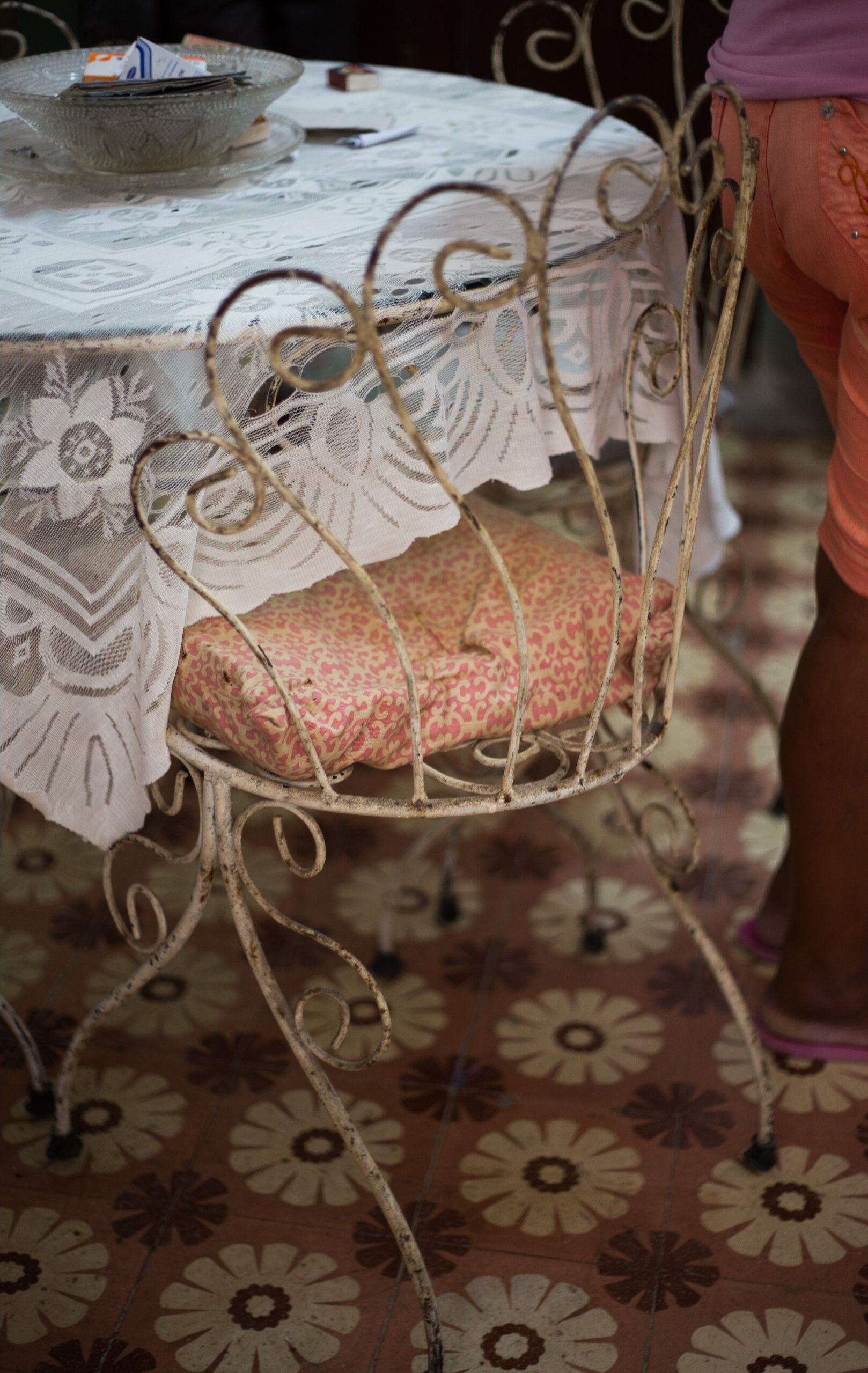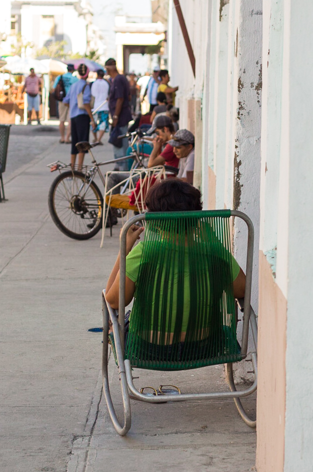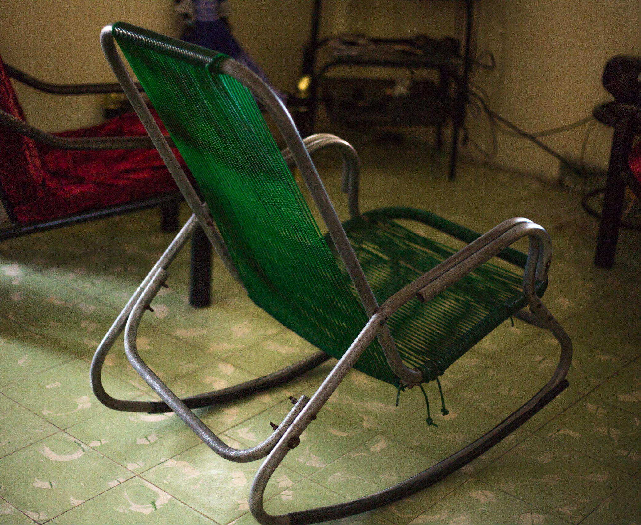 All around Cuba people sit outside their houses or businesses, taking advantage of any wafts of cool air. People sit on steps, boxes, curb-stones, wooden stools and if they’re lucky, a favourite chair. Often these chairs look like home-made affairs, ingeniously bent lengths of rebar or other steel rod, forming a basic structure sometimes adorned with flourishes. They are mostly very old, worn, re-painted and above all, well-used.