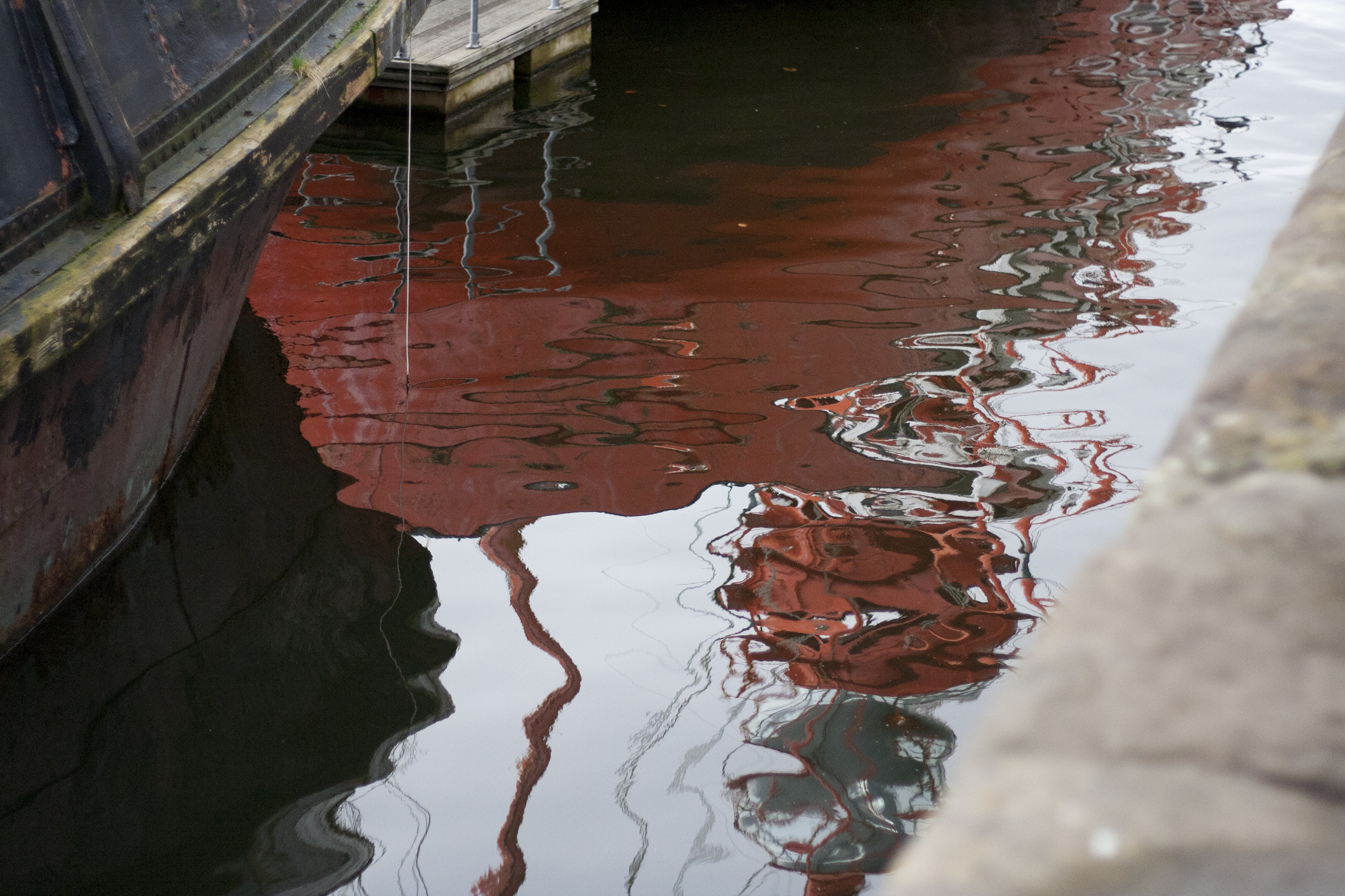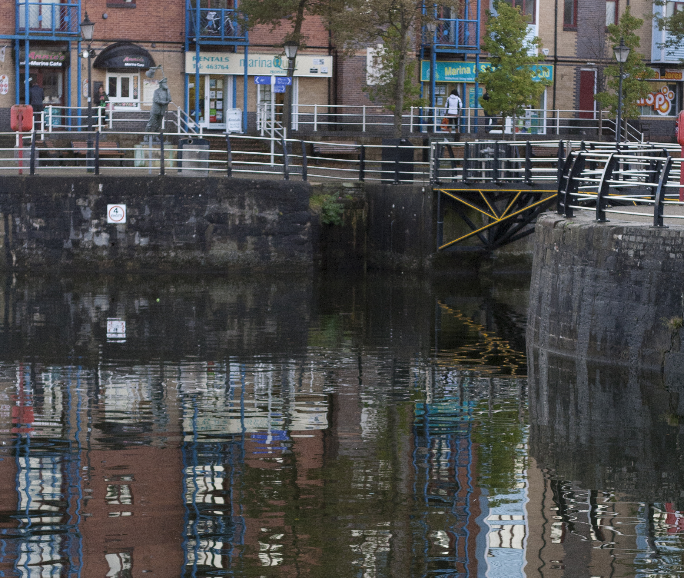 A recent visit to the marina in Swansea offered up such delights, boat hulls, railings, brickwork, an endless rippling reflection of intense colours. The whole area has been transformed from the working harbour docks when it was no doubt dark and noisy and any colour suffused by coal dust. There are numerous shiny modern yachts moored here now but also just a few memories of its previous incarnation, the massive stone docks, gates and lift bridges.