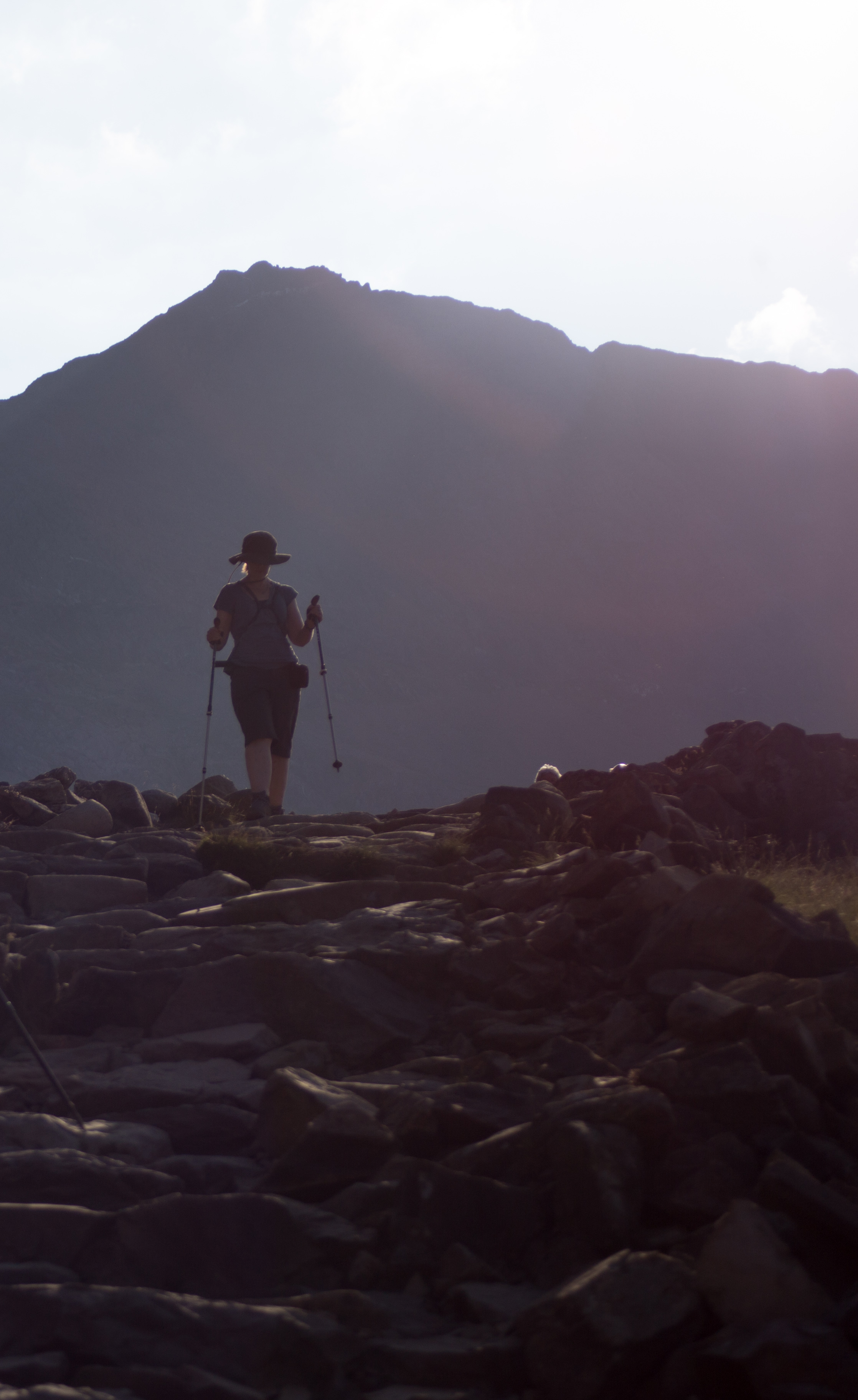 For the first time I braved the challenge of walking down Snowdon, I had taken the train up but walked down via the Pyg track. It was a scorching day in late July, I was with four friends, all probably fitter than I. It started off well enough, the views were spectacular, I had plenty of water and the route was well known to our leader, I was enjoying it immensely. But after a long tiring struggle – downwards walking is so hard on the knees – I was enjoying it a lot less.  Using the last of my energy I pushed on a bit faster, to end the seemingly interminable descent a little quicker. I lost sight of the others but sensibly stopped and waited. The sun was behind Snowdon and the light was falling across the ridge, I hoped I might just be able to take a good photograph as one or other of them appeared over the intermediate horizon.