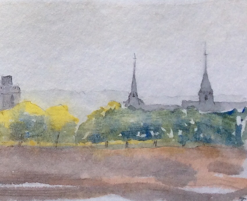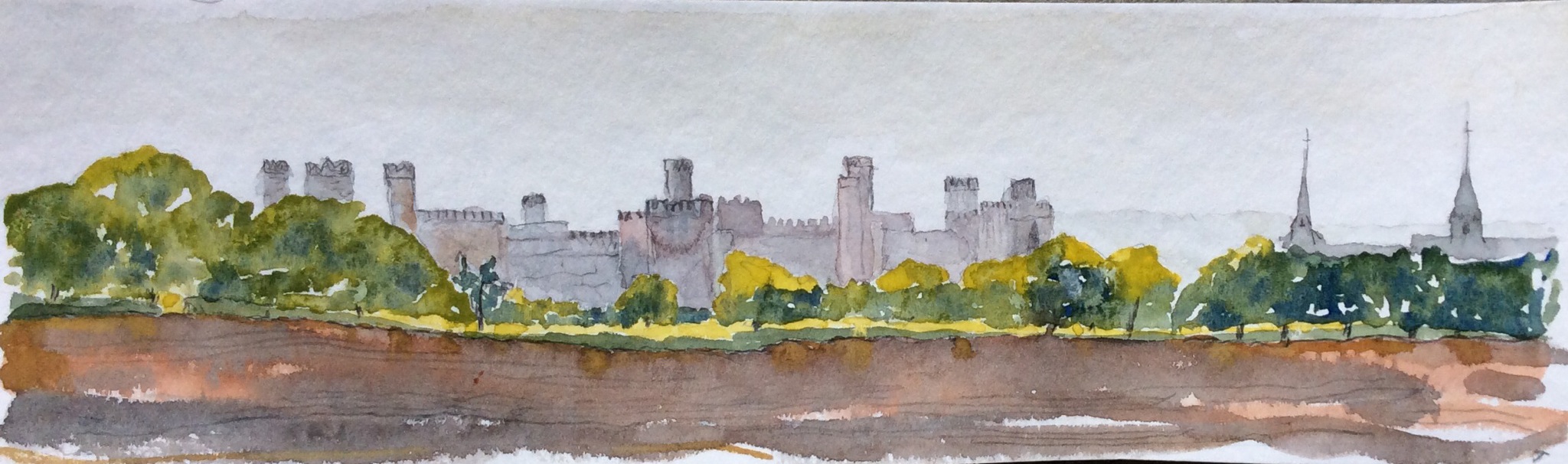 Whilst I was painting this watercolour, the light changed, the rocks became darker, almost purple black. For around ten minutes a bright yellow rescue helicopter hovered over Bristly Ridge, the peak at the left, then flew towards me, turned and set off towards Bangor, to the hospital I suppose.