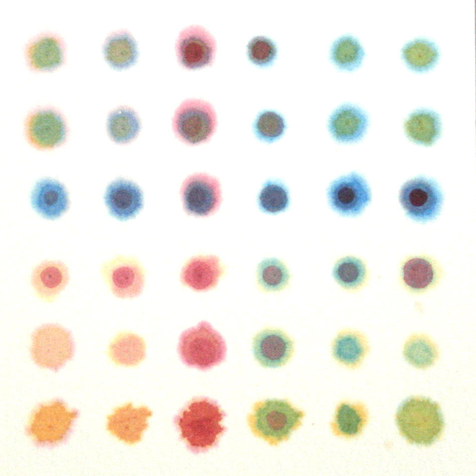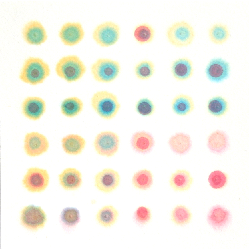 As a jeweller my work is very much about control, my designs are geometric and ordered, serendipity is a rare and welcome component, usually appearing whilst pushing the limits of the material. This process follows through in this series of paintings. I begin from a precise positioned grid of marks, working on wet and/or dry paper, overlaying in several passes following a strict order whilst allowing accidental or material based irregularities to occur. Colours are applied with droppers and with broad washes laid over dried dots, allowing the colours to soften and run at will.